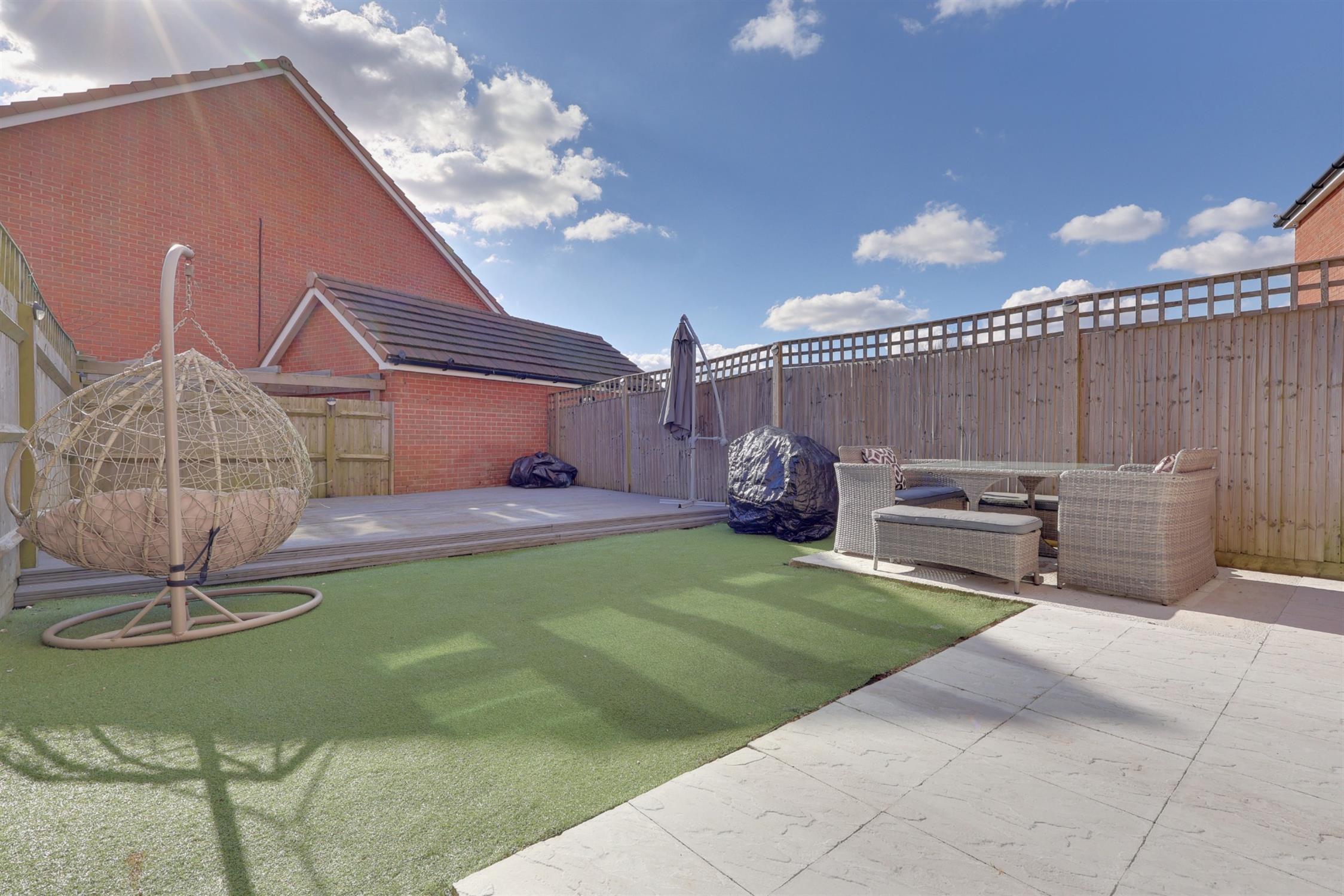 Situated in South facing garden, the outdoor space features an AstroTurf lawn, a patio area, fenced boundaries, a shed, and side pedestrian access.