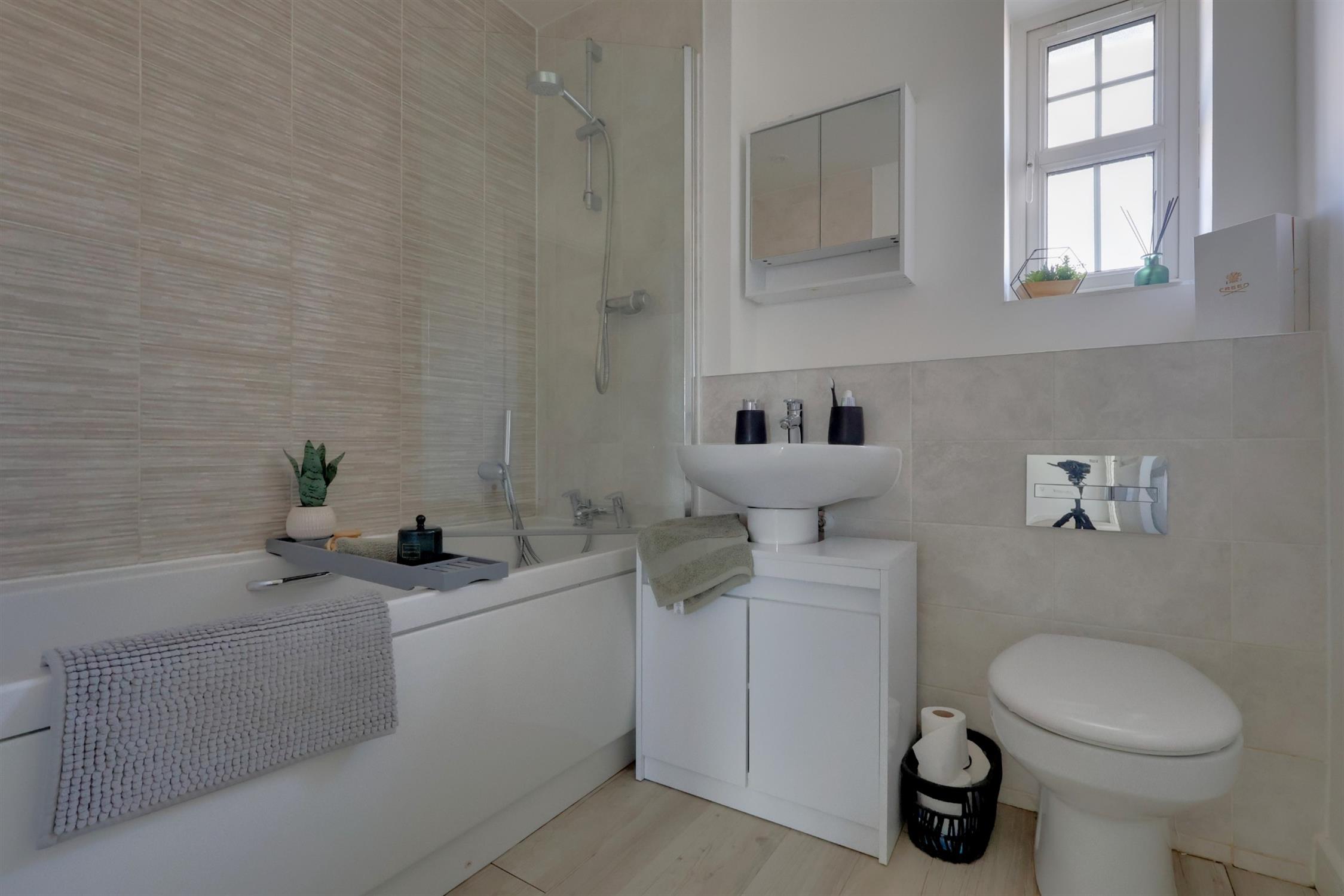 Featuring an obscured double-glazed window, a three-piece suite comprising a panel bath with a shower over, a low-level WC, and a pedestal wash hand basin. The walls are partly tiled, radiator.