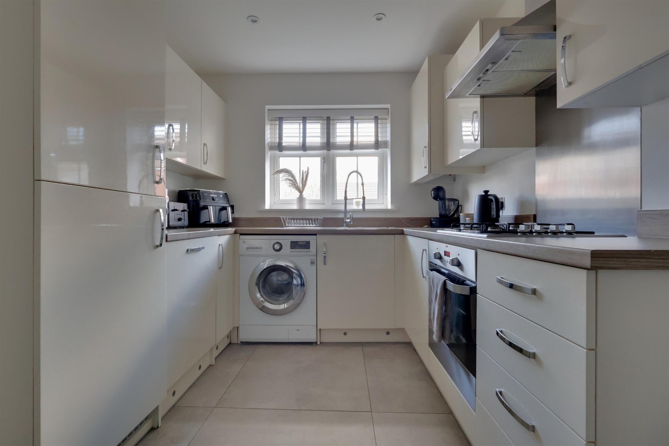 The kitchen benefits from a double-glazed window to the front elevation and is fitted with a range of wall and base units with hard-top work surface incorporating a 1.5 sink with a mixer tap. Integrated appliances include a four-ring gas hob with an extractor hood above and an oven below, a fridge freezer, and a dishwasher. There is also space for a washing machine, a radiator, a tiled floor, and a wall-mounted concealed boiler.