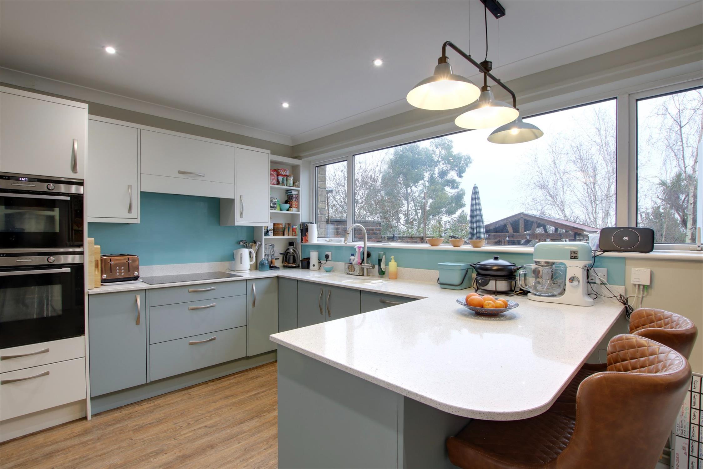 Double glazed window to rear elevation. Refitted kitchen comprising double bowl sink unit set into a quartz work surface which continues to provide ample preparation and breakfast bar with a comprehensive range of wall and base level units. Built-in four ring induction hob with cooker hood over. Built-in combination microwave oven and further fan-assisted oven below. Built-in dishwasher and fridge. Coved and skimmed ceiling. Inset ceiling spotlights. Double glazed door to outside. Luxury vinyl flooring. Door to: