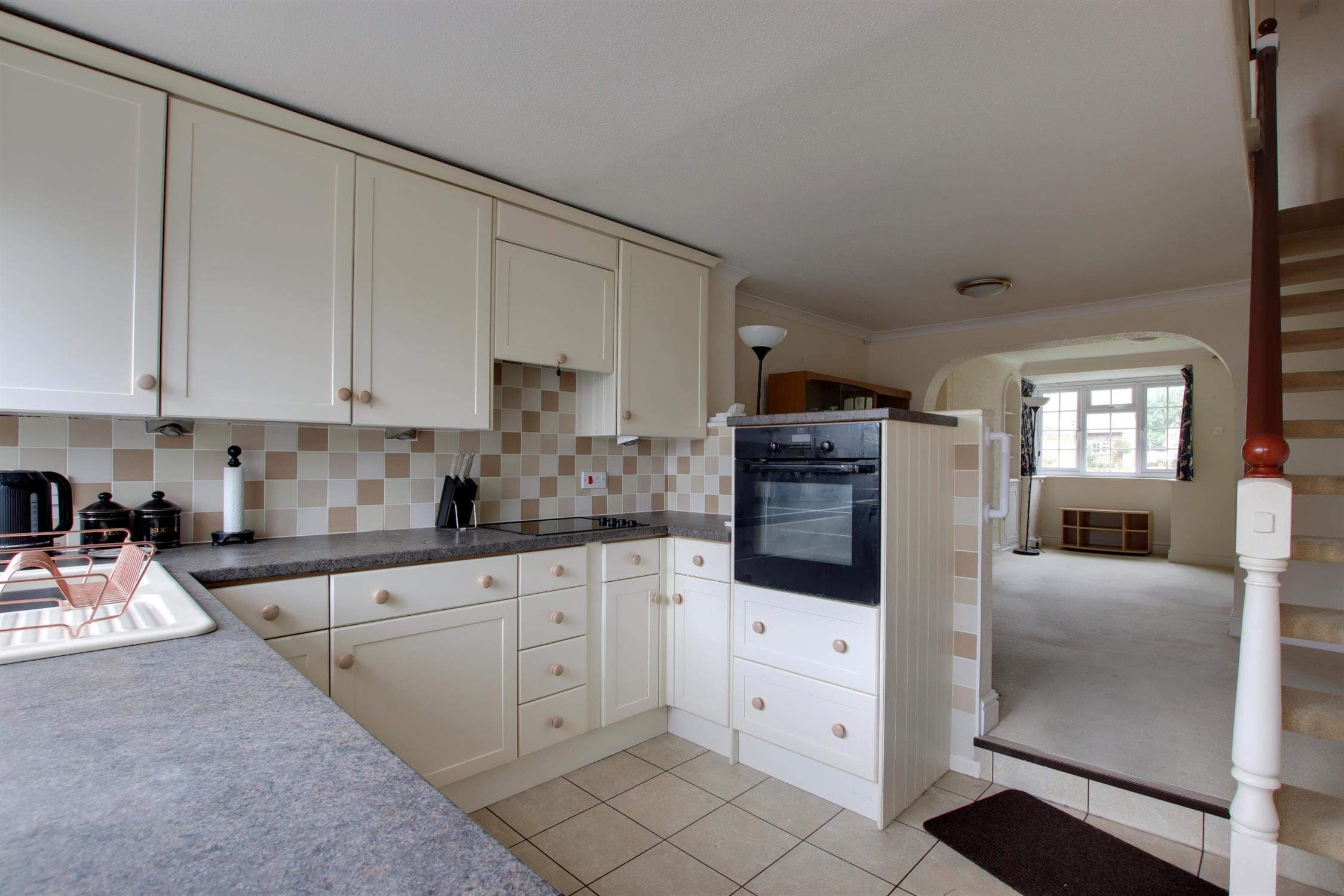 Double glazed window to rear elevation. Kitchen comprising; inset single drainer sink unit with cupboard under. Further range of wall and base level units with roll edge work surfaces over and splashback tiling. Built-in four ring ceramic hob with cooker hood over. Built-in electric fan assisted oven with pan drawers below. Built-in and concealed fridge, freezer and washing machine. Tiled flooring. Radiator. Stairs to first floor. Part glazed door to: