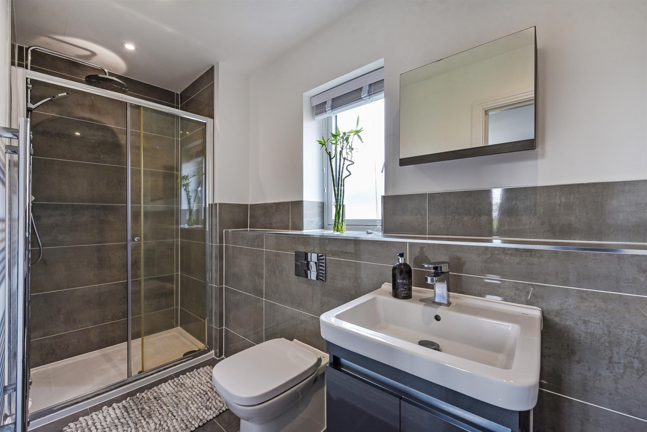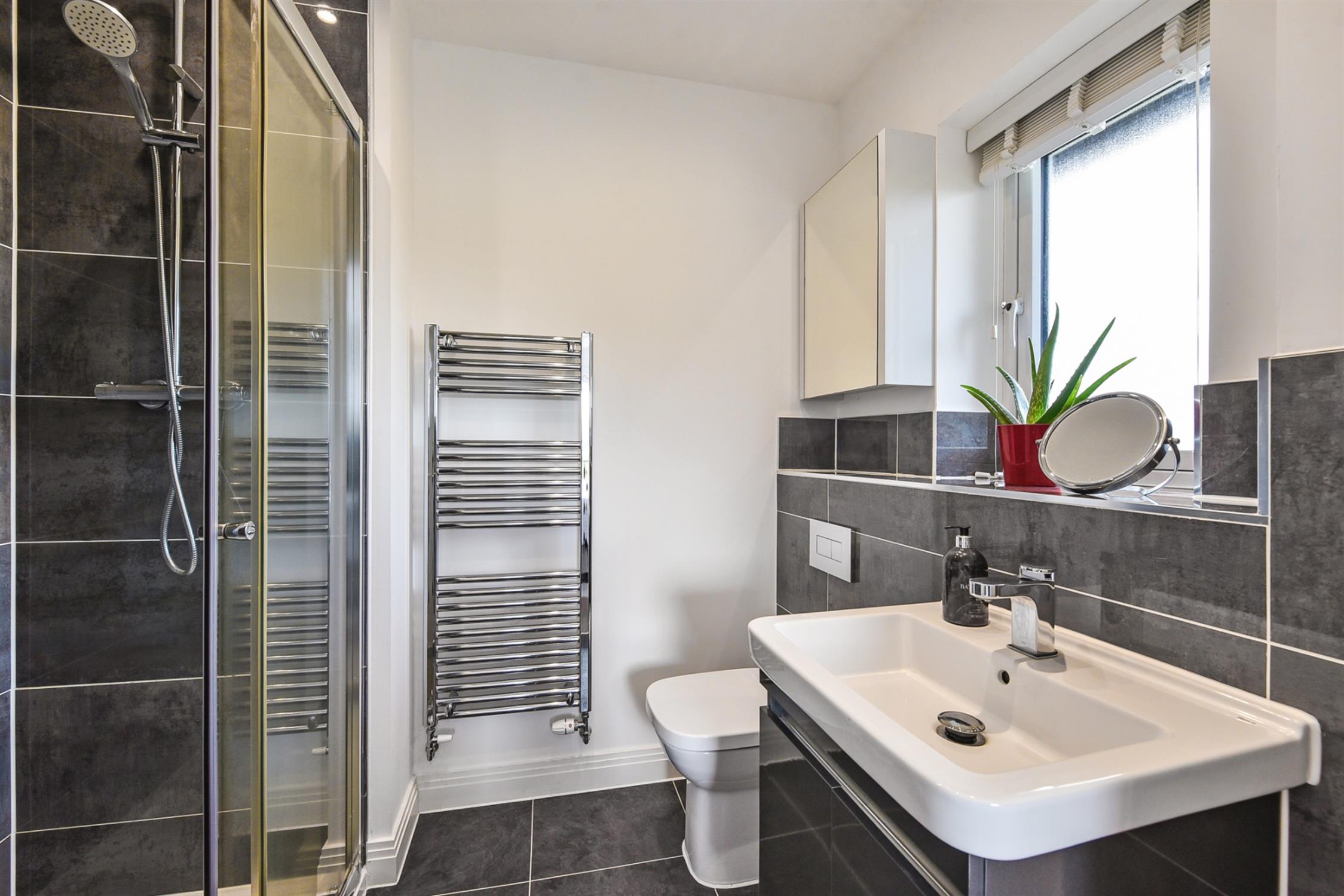 Bath with shower over, basin on vanity unit, toilet and heated towel rail.