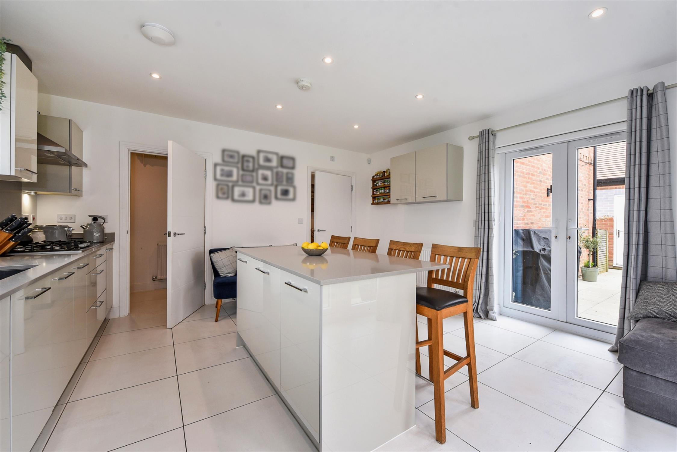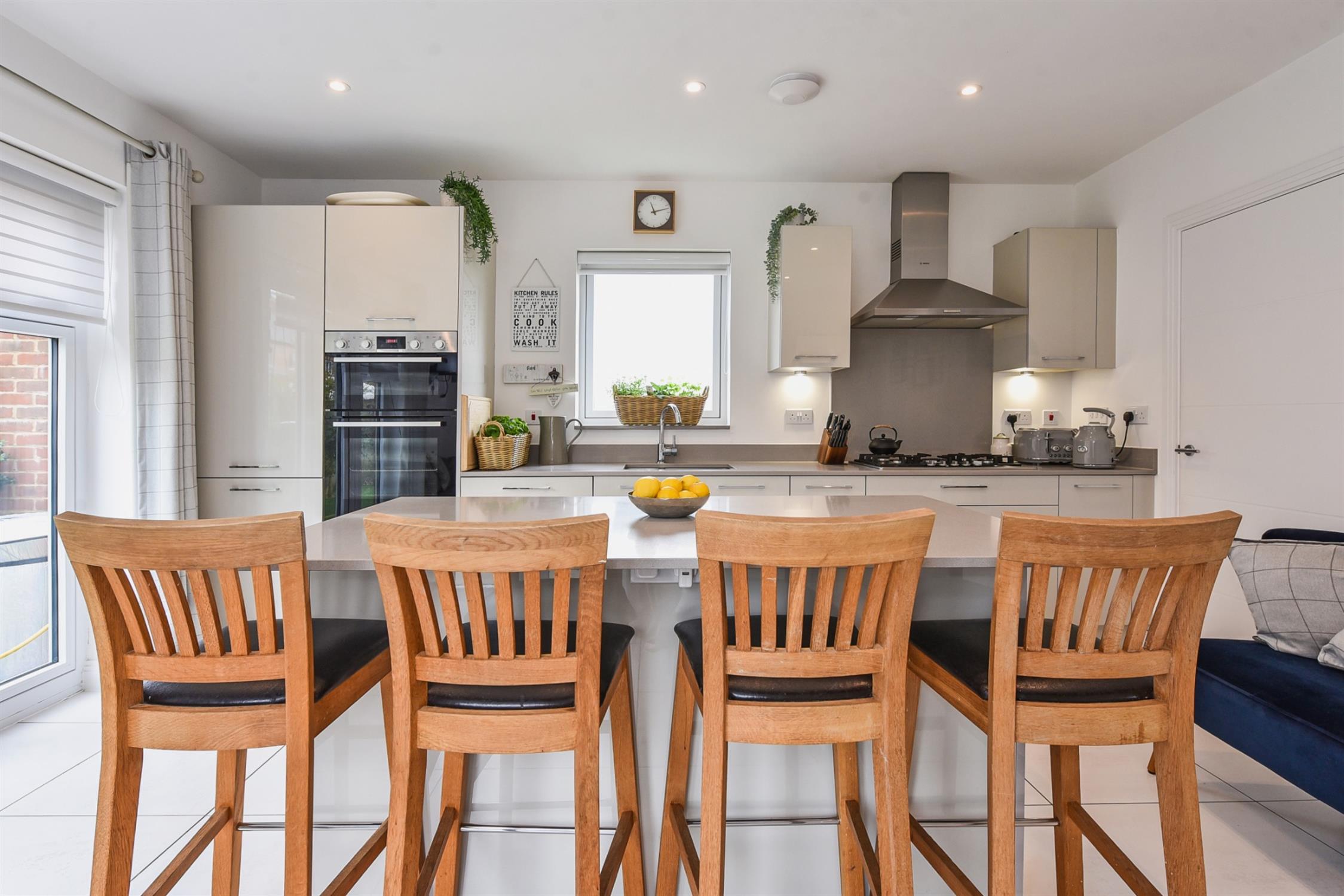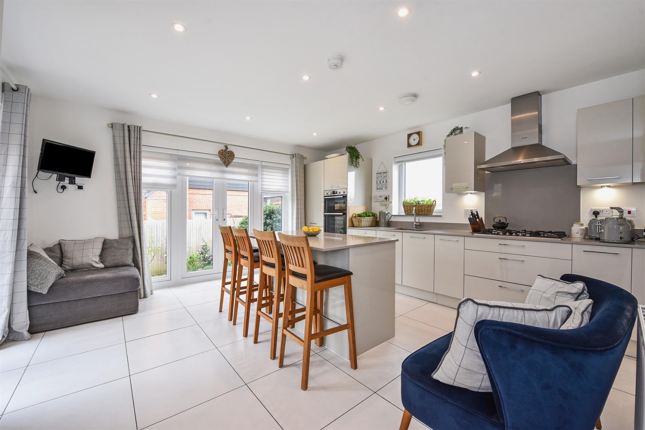 A very bright triple-aspect space with wonderful countryside views. The kitchen is fitted to a high standard, with slimline solid Quartz worktops and a good range of light grey units and kitchen island with breakfast bar and storage. Integrated appliances include Bosch waist-height double oven, fridge-freezer, Bosch five-ring gas hob, Bosch dishwasher and double sink. Two sets of double doors to the garden. A full set of day/night blinds.