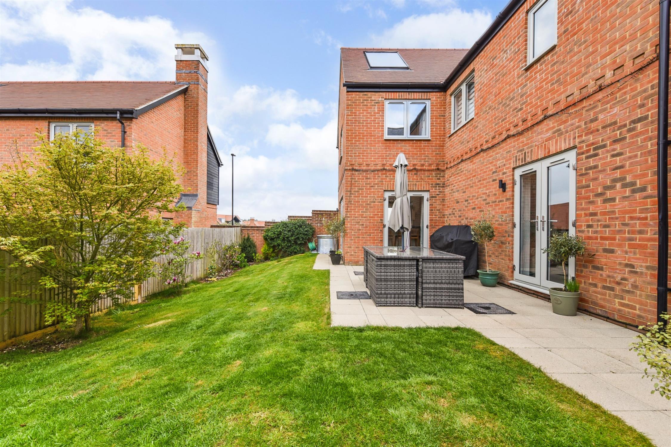 Patio adjacent to kitchen and dining room, creating the potential for circular entertaining. The remainder laid to the lawn with planting. Door to double garage and gate to the driveway.
