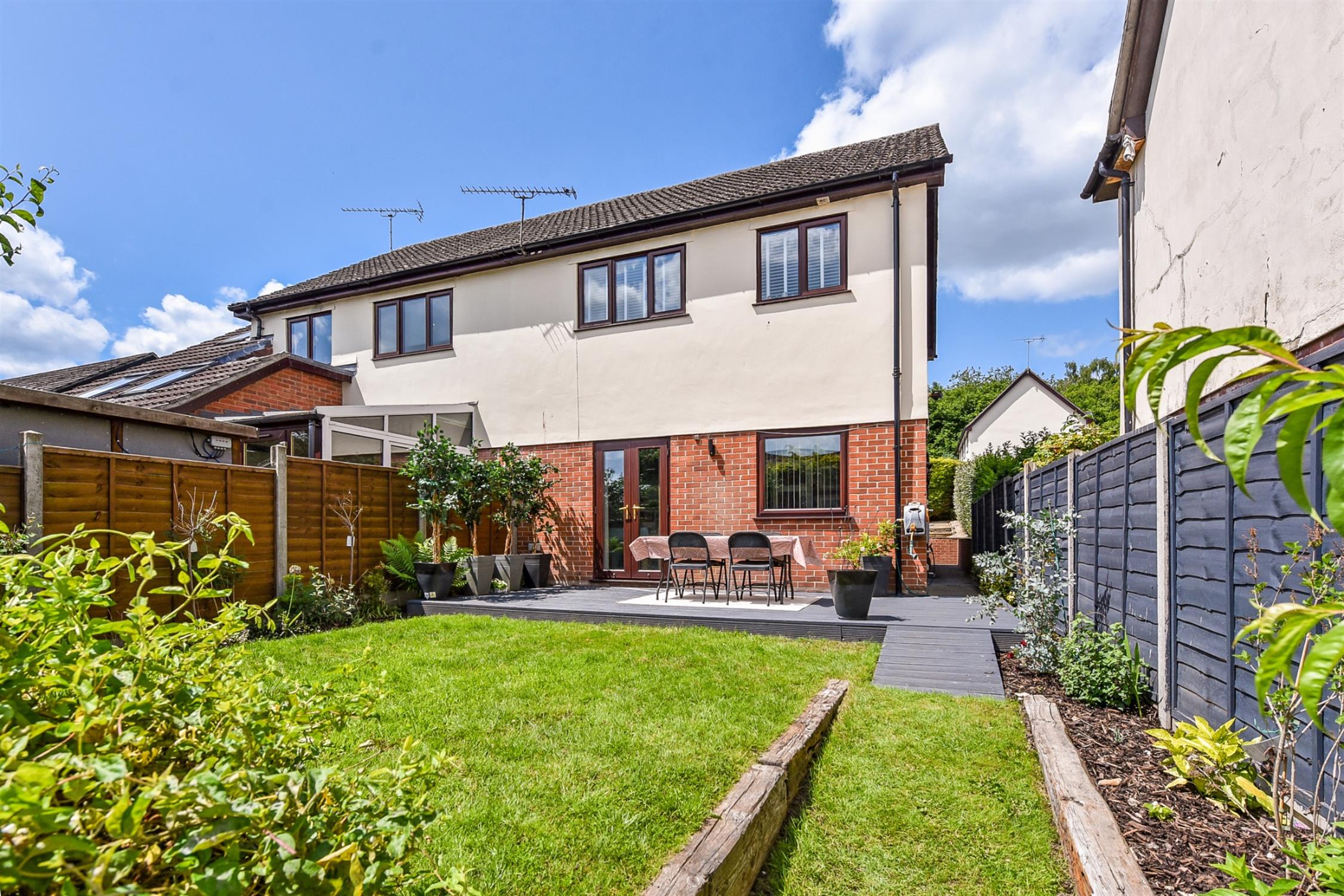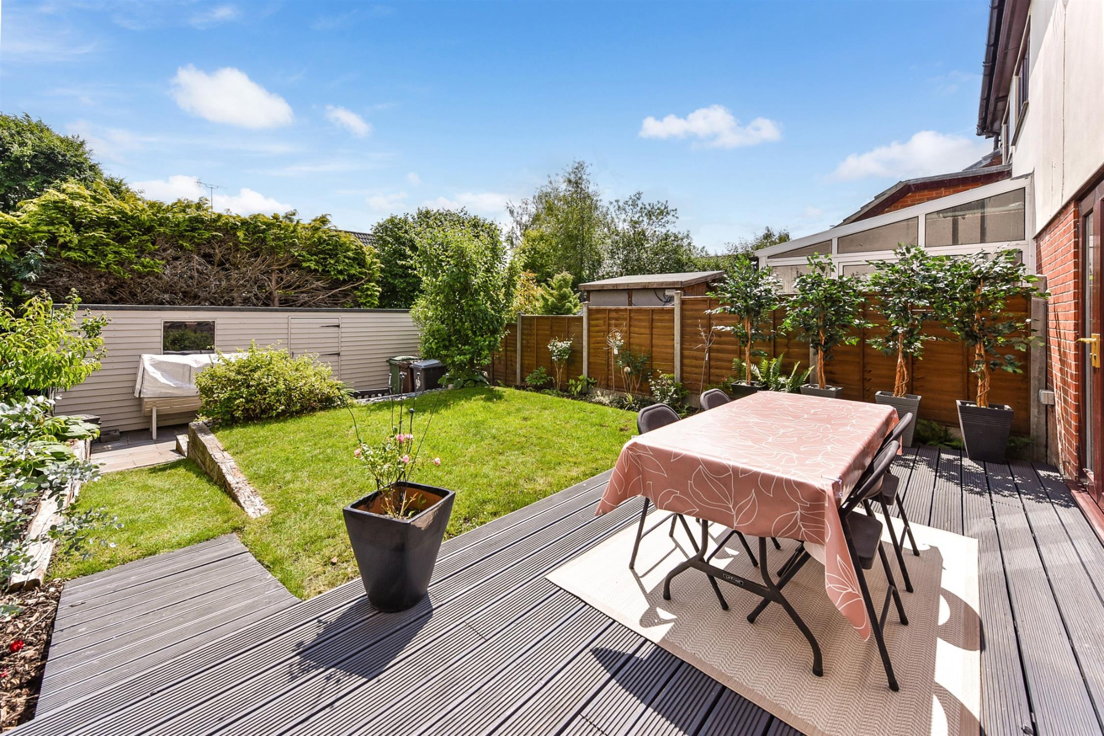 Beautifully designed garden with decking adjacent to the dining area. A well manicured lawn, surrounded with railway sleepers. On the lower level is a patio area with large shed spanning the width of the garden.