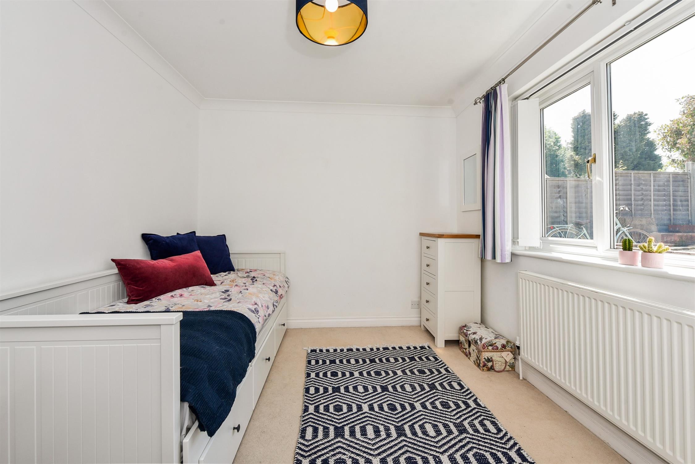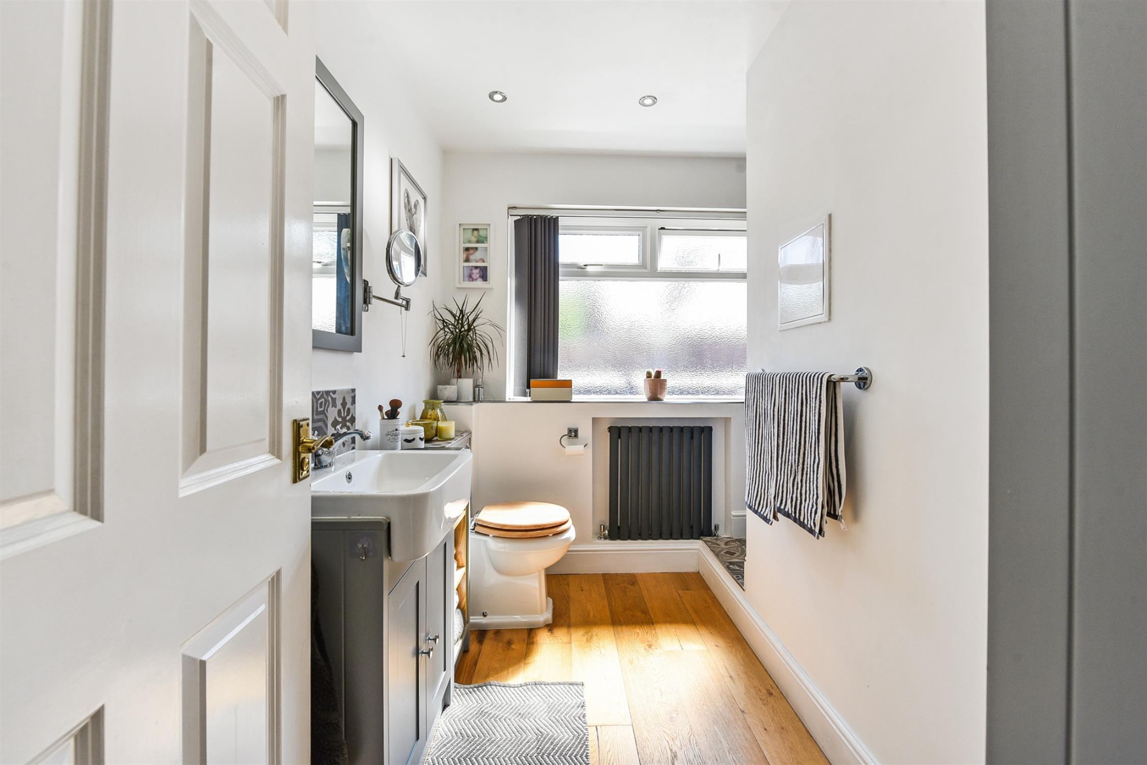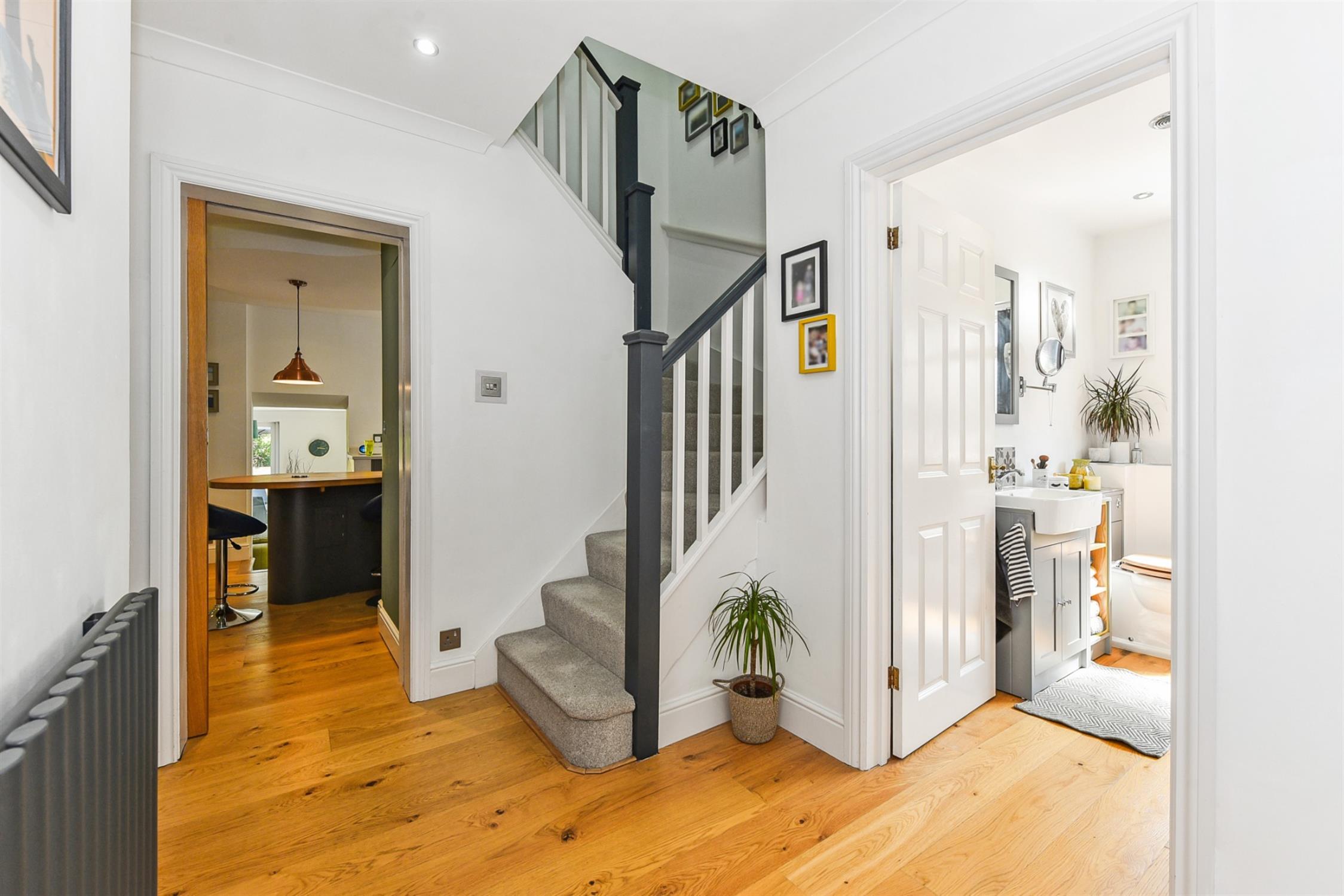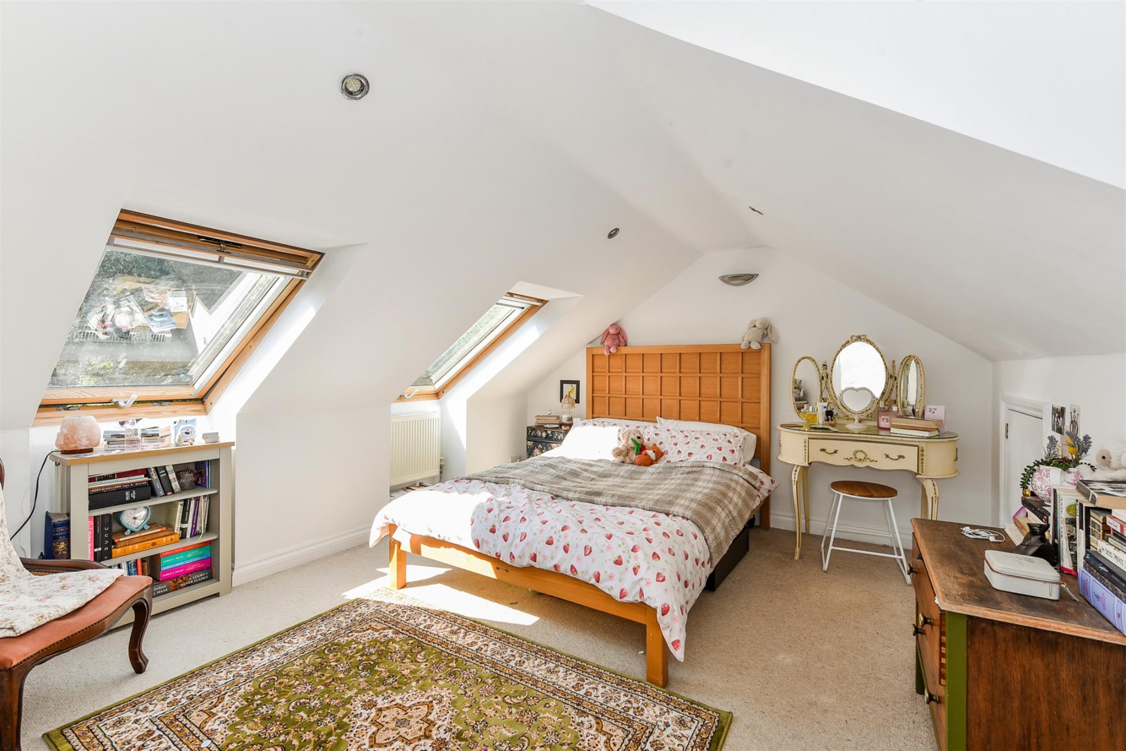 On the first floor, there is an impressive master bedroom set on two levels, with a bank of fitted wardrobes. Doors open to a Juliet balcony overlooking the garden. The second bedroom is wonderfully bright, with built in storage, and the refurbished family bathroom offers bath, separate shower and a very large eaves storage cupboard.