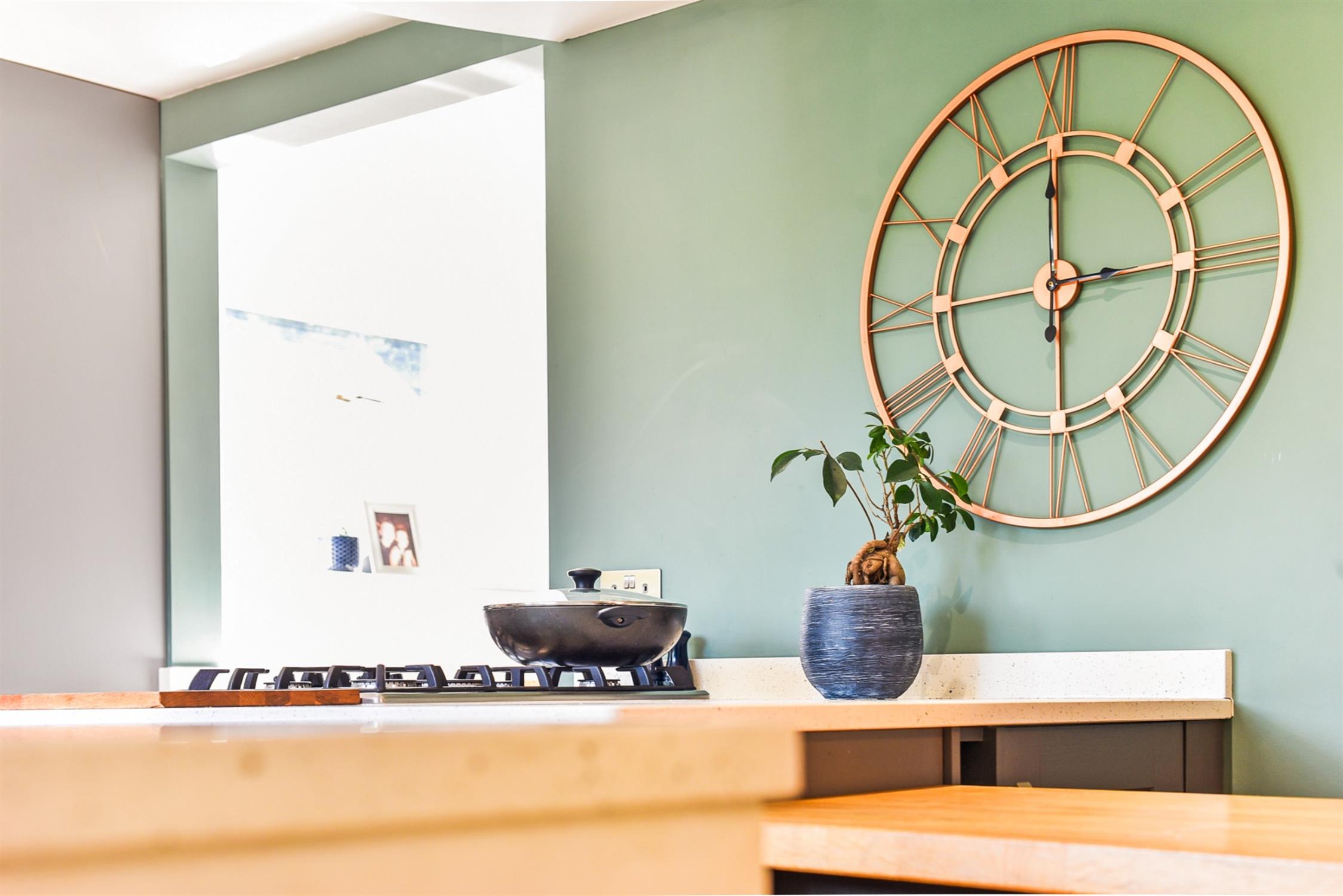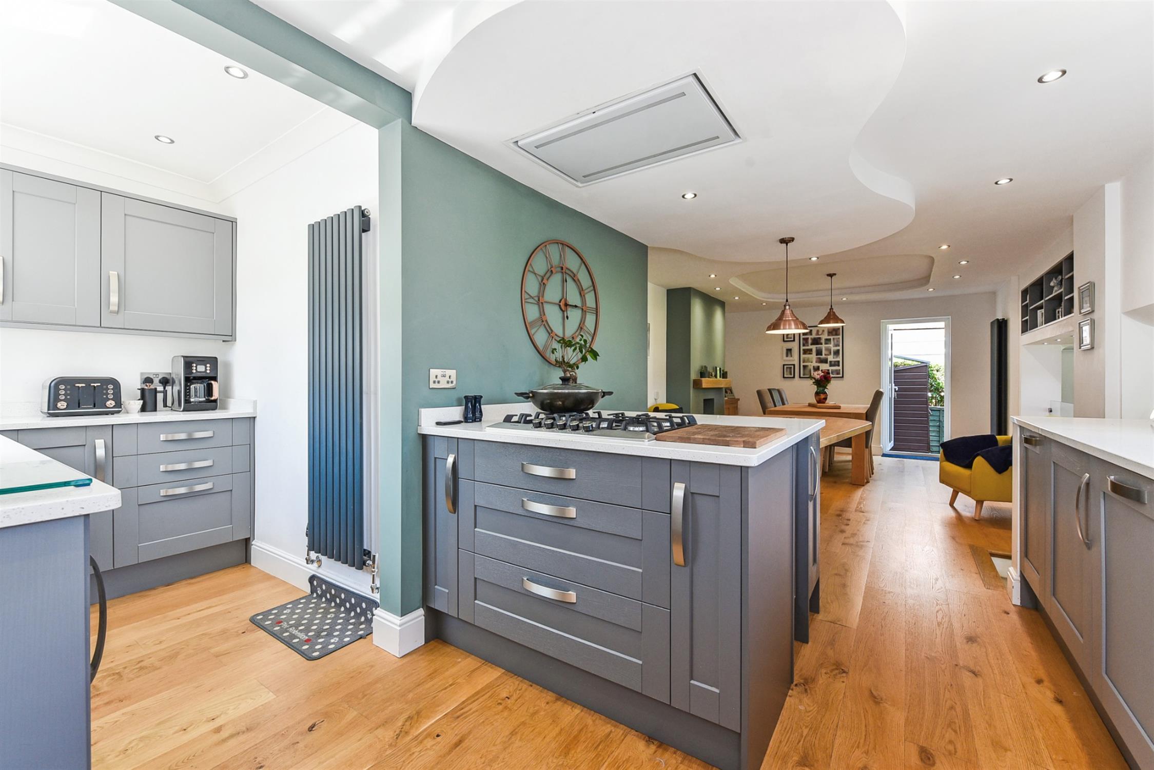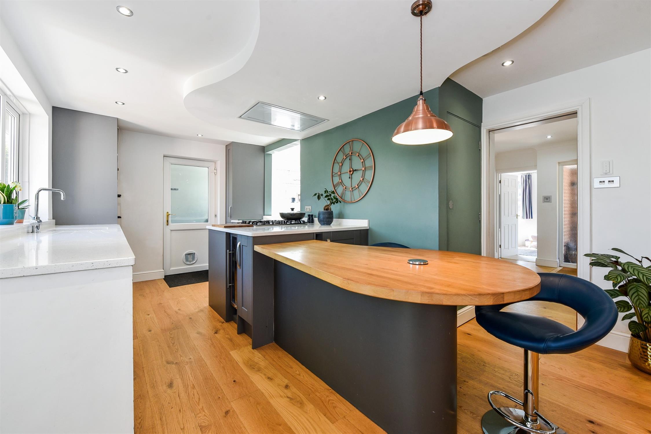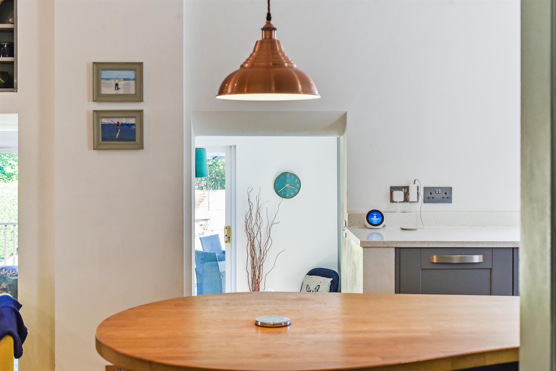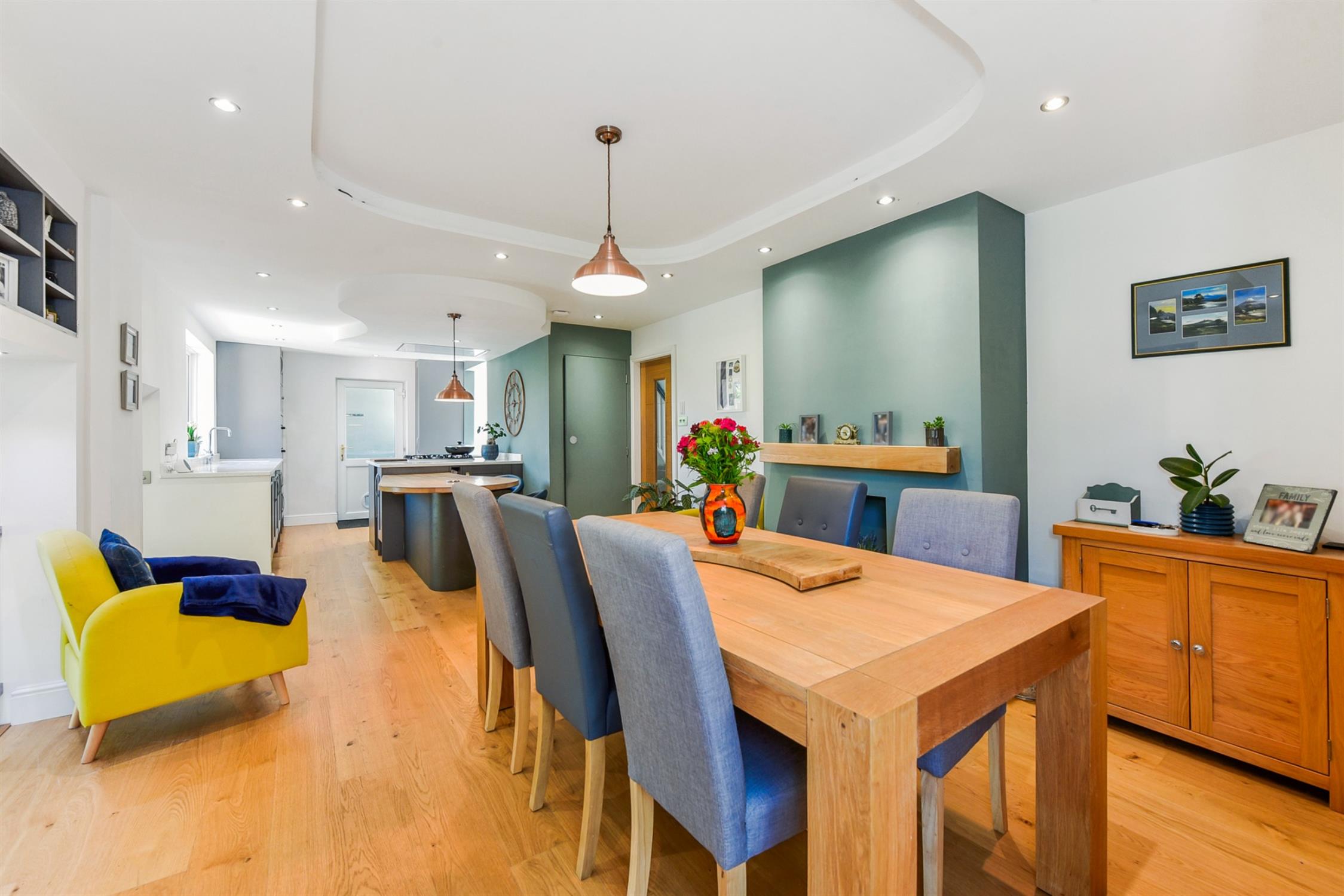 A pocket-door leads through to the kitchen. This space is such a highlight of the house, having been uniquely designed, the kitchen, dining area and living room are split-level and open plan, offering open yet distinct layers of entertaining space, with an aperture offering a window to the living room and garden beyond. The kitchen is fitted to a high-standard, featuring hand-made solid wood breakfast island, the curves of which mirror the ceiling detail. This comes off a peninsula island with wine fridge and five-ring gas hob. The worktops are white Quartz and the integrated appliances include instant hot water tap, double oven, dishwasher, microwave, fridge and freezer. The breakfast table island has concealed rising plug column with USB sockets and bluetooth audio and the room has smart lighting. A door from the dining area leads to the side, and rear garage access. Stairs descend to the generous living room, which has a bespoke media wall with concealed cabling and inset aperture for a TV up to 65 inches. 3-panel sliding doors lead out onto the decking.