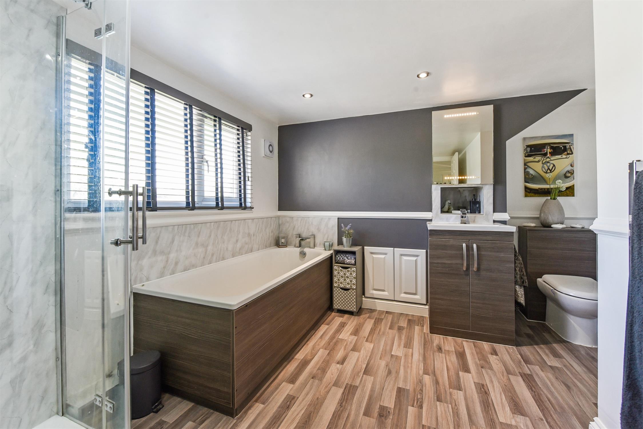 The driveway to the front offers ample parking for many vehicles as well as access to the garage, with a covered porch leading to the front door. The hall is a great space, with engineered oak flooring running throughout. From here there is access to all ground floor accommodation and stairs to first floor. Two bedrooms can be found on the ground floor, both of which are doubles. There is also a contemporary shower room with large walk-in shower.