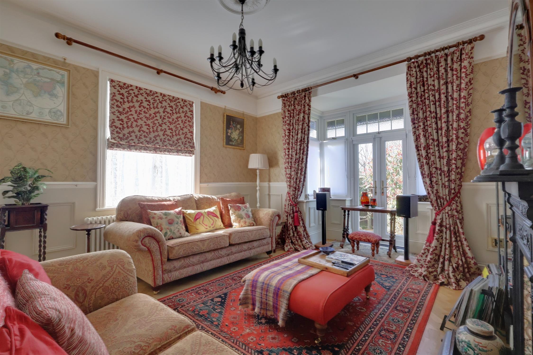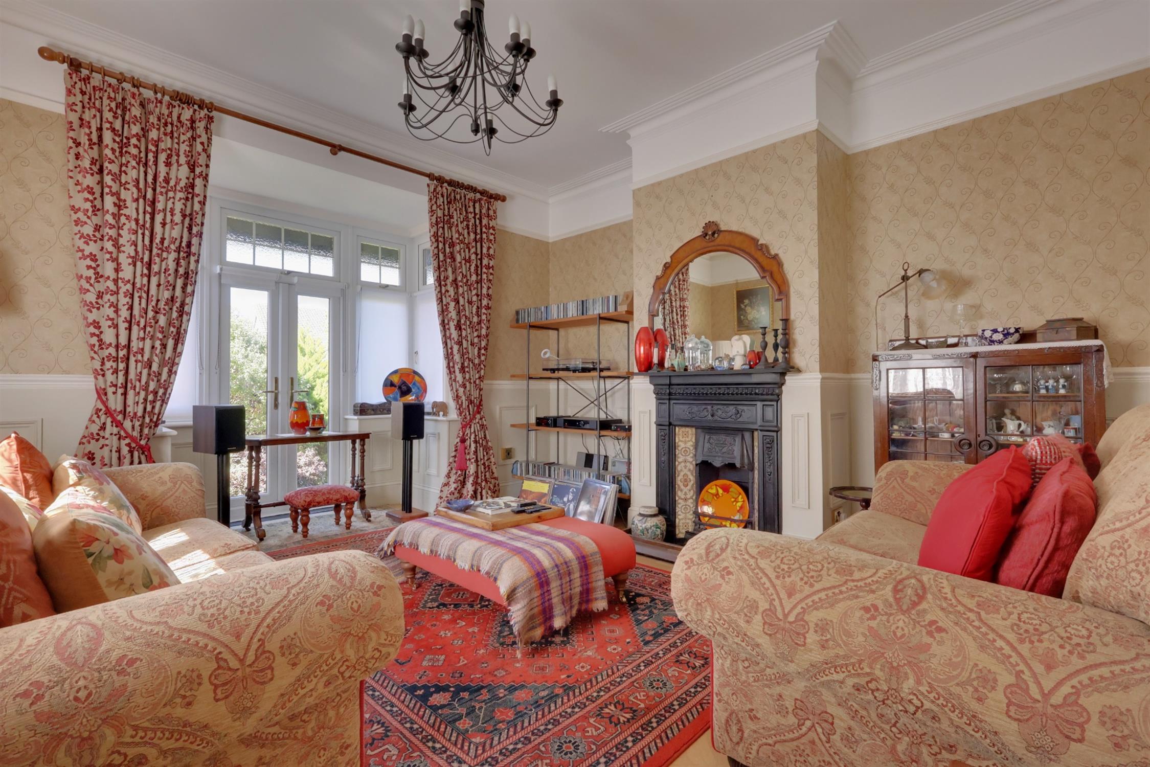 Period fireplace. Parquet flooring. Double glazed window. Double glazed bay with French doors opening into the gardens.