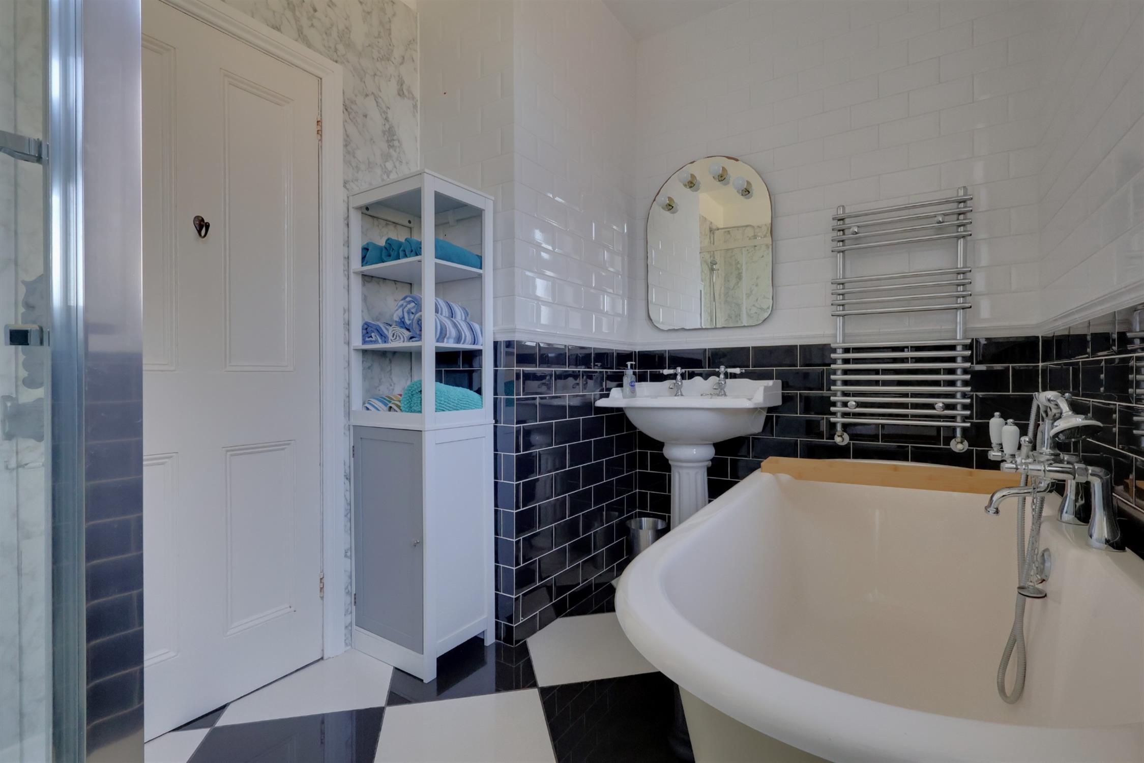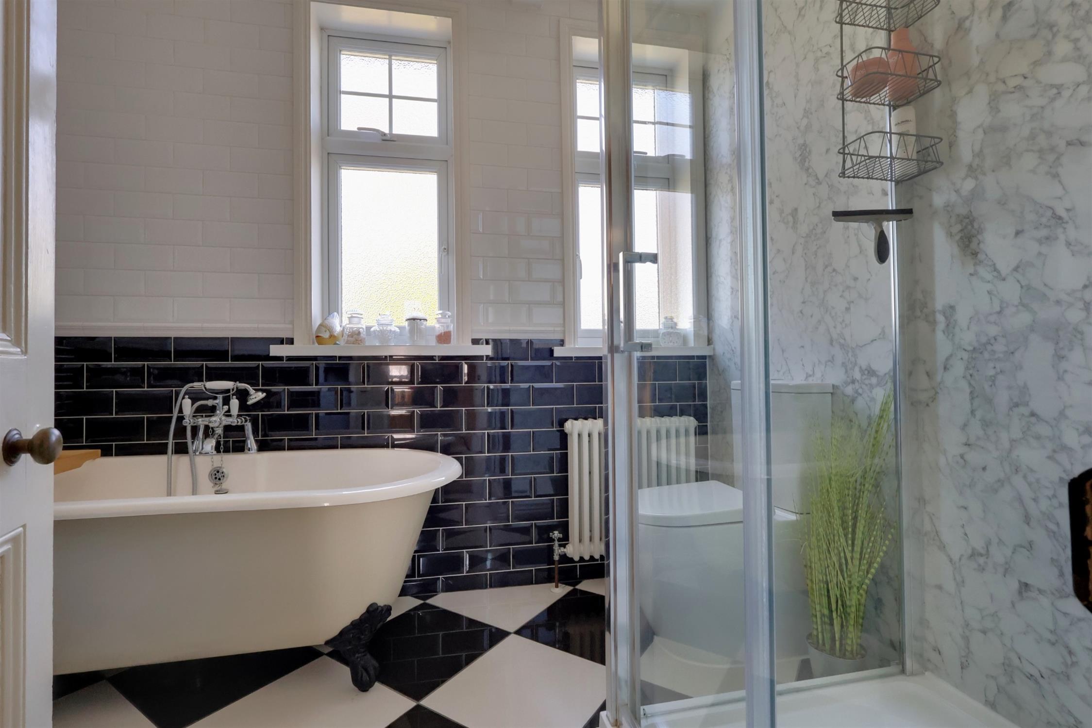 Freestanding bath. Ceramic sink. WC. Shower cubicle. Heated towel rail. Radiator. Tiled flooring and walls. Two frosted double glazed windows.