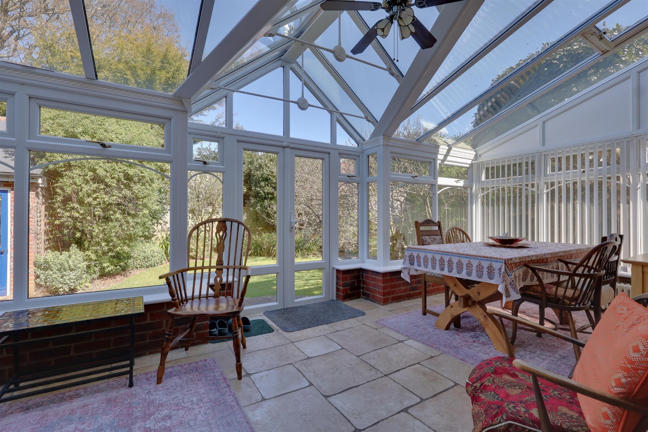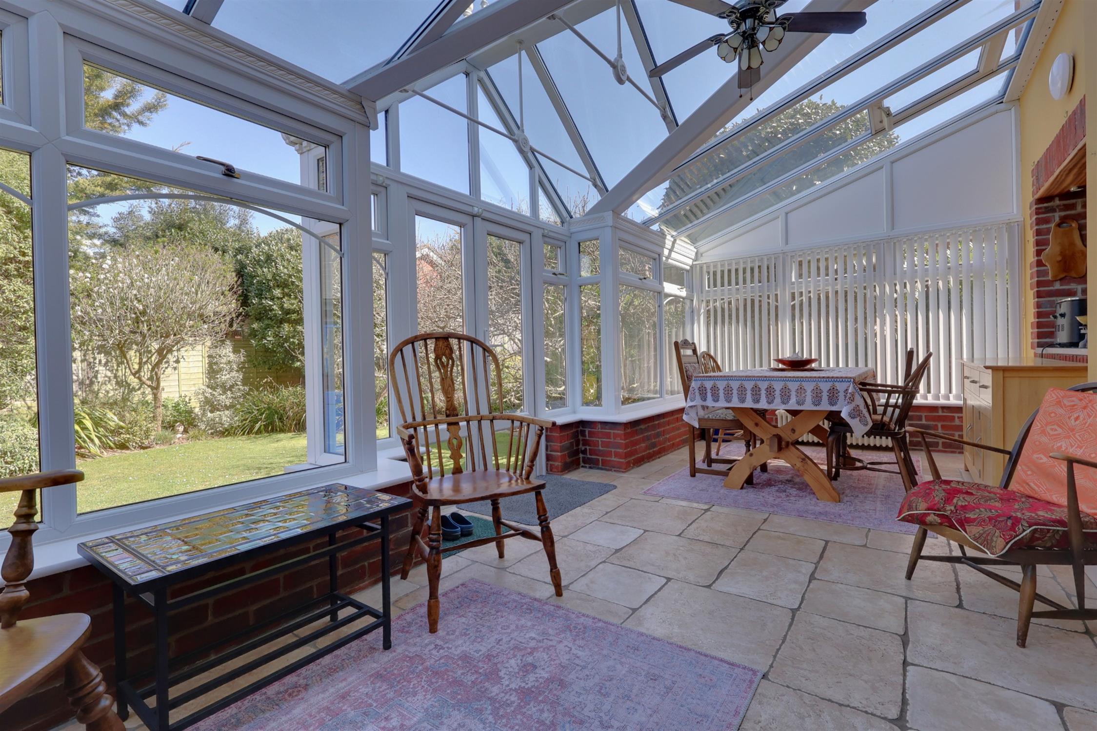 Two radiators. Wood burning stove. Tiled flooring. Fully double glazed with French doors opening into the garden.