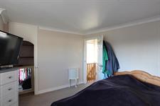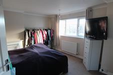 BEDROOM ONE (FRONT): Magnolia walls with radiator under window, cream carpets, double-glazed window, small built in storage area.