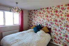 BEDROOM TWO (REAR): Magnolia walls with radiator under window and floral feature wall, cream carpets, boiler to corner, small storage cupboard.