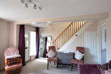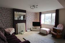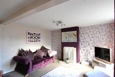 LOUNGE: Spacious lounge, magnolia walls, feature wall and fireplace housing an electric fire, double-glazed windows with radiator below, cream carpets, under stairs storage cupboard housing gas and electric meters and fuse board.