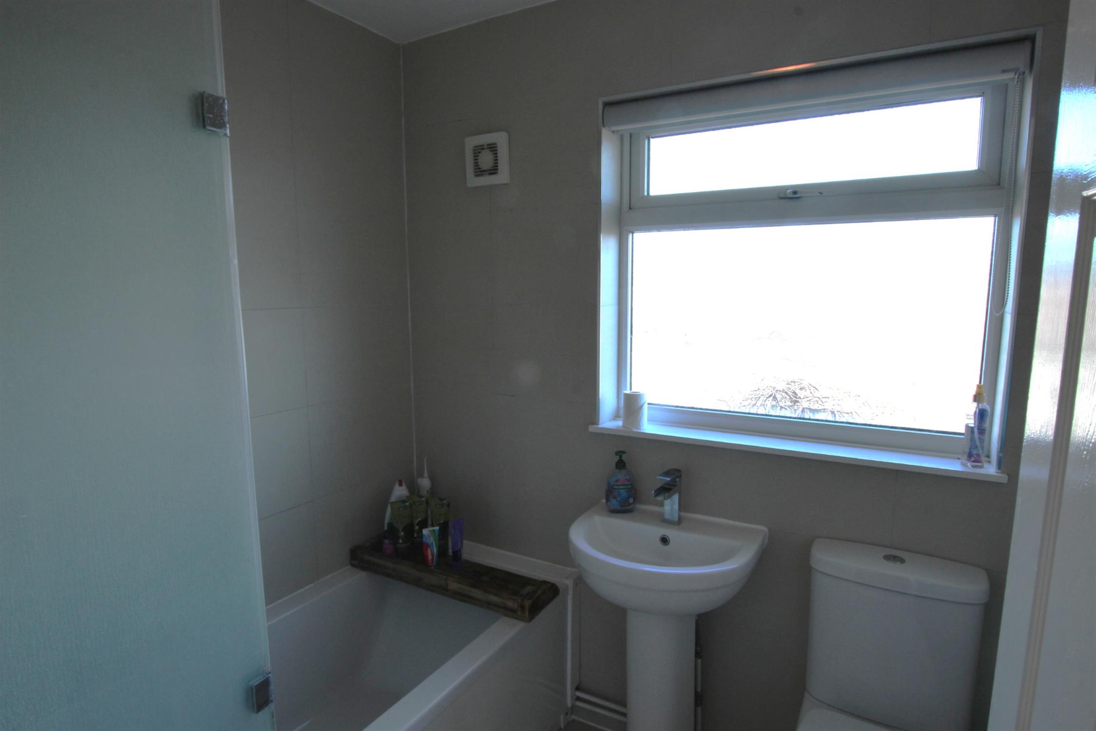 BATHROOM: White bathroom suite with cream tiled walls, tiled floors, WC, pedestal hand basin with mixer tap, bath with mixer tap and glass shower screen, wall mounted extractor fan, chrome ladder towel rail, double glazed window.