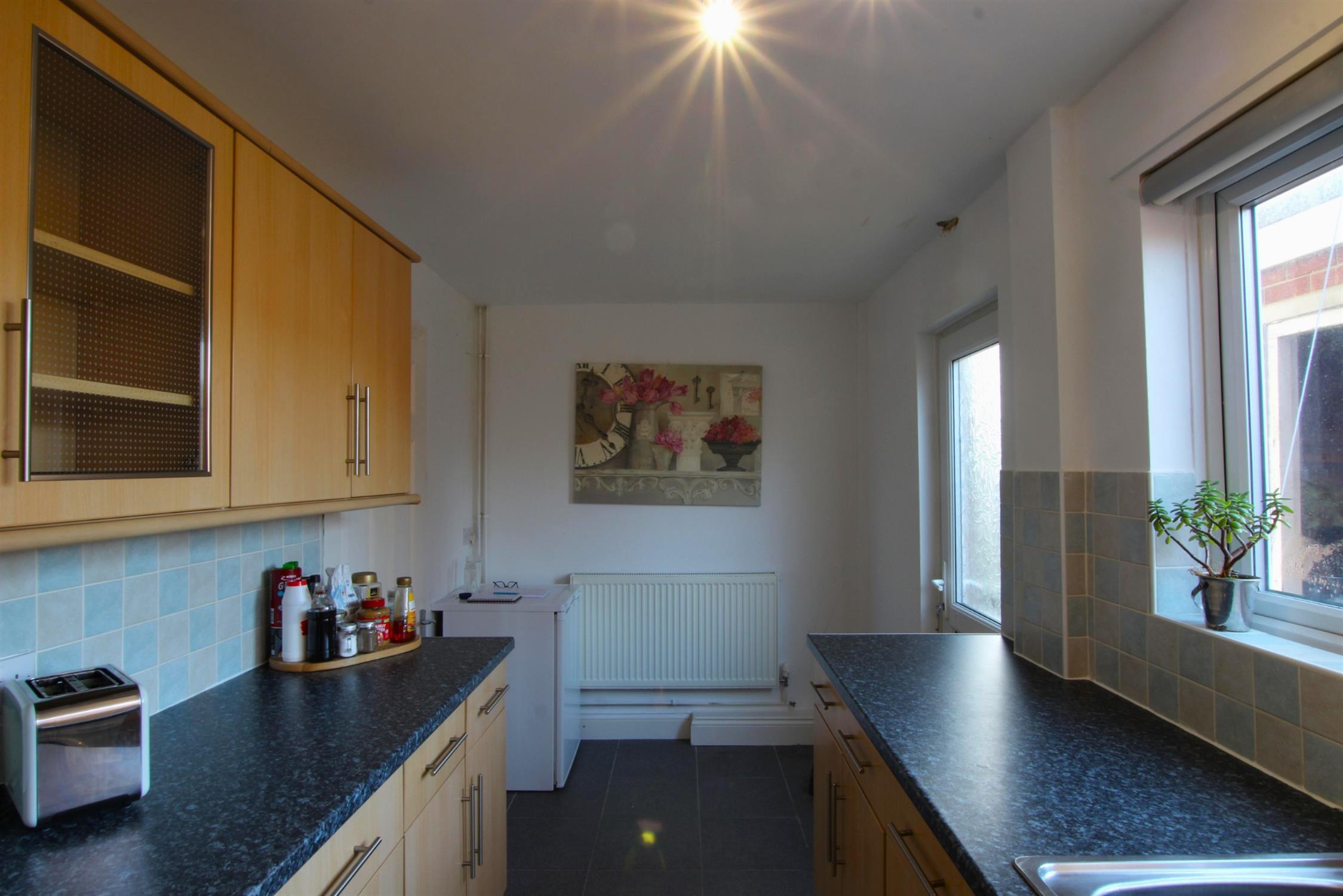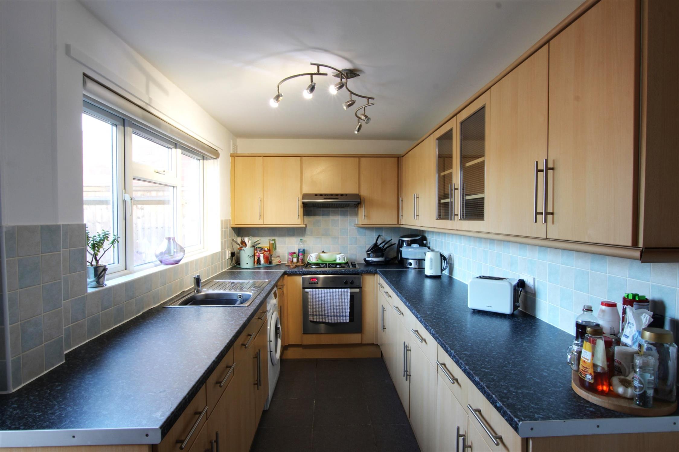 KITCHEN: Modern U-shaped kitchen with white walls and a tiled splashback, a range of wall and base units for ample storage and workspace, radiator to end wall, built-in under-counter fridge and freezer, 4-ring gas hob with extractor hood and an electric oven, stainless steel sink with drainer, plumbing for a washing machine, double-glazed window and rear door leading to:-