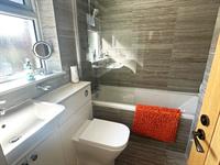 Obscure double glazed window to rear. Comprising white suite of tile panelled bath with shower fitted over and glazed shower screen. Concealed flush WC. Inset wash hand basin with cupboards below. Fully tiled complementary tiling. Chrome heated towel radiator. Inset ceiling light with extractor fan.