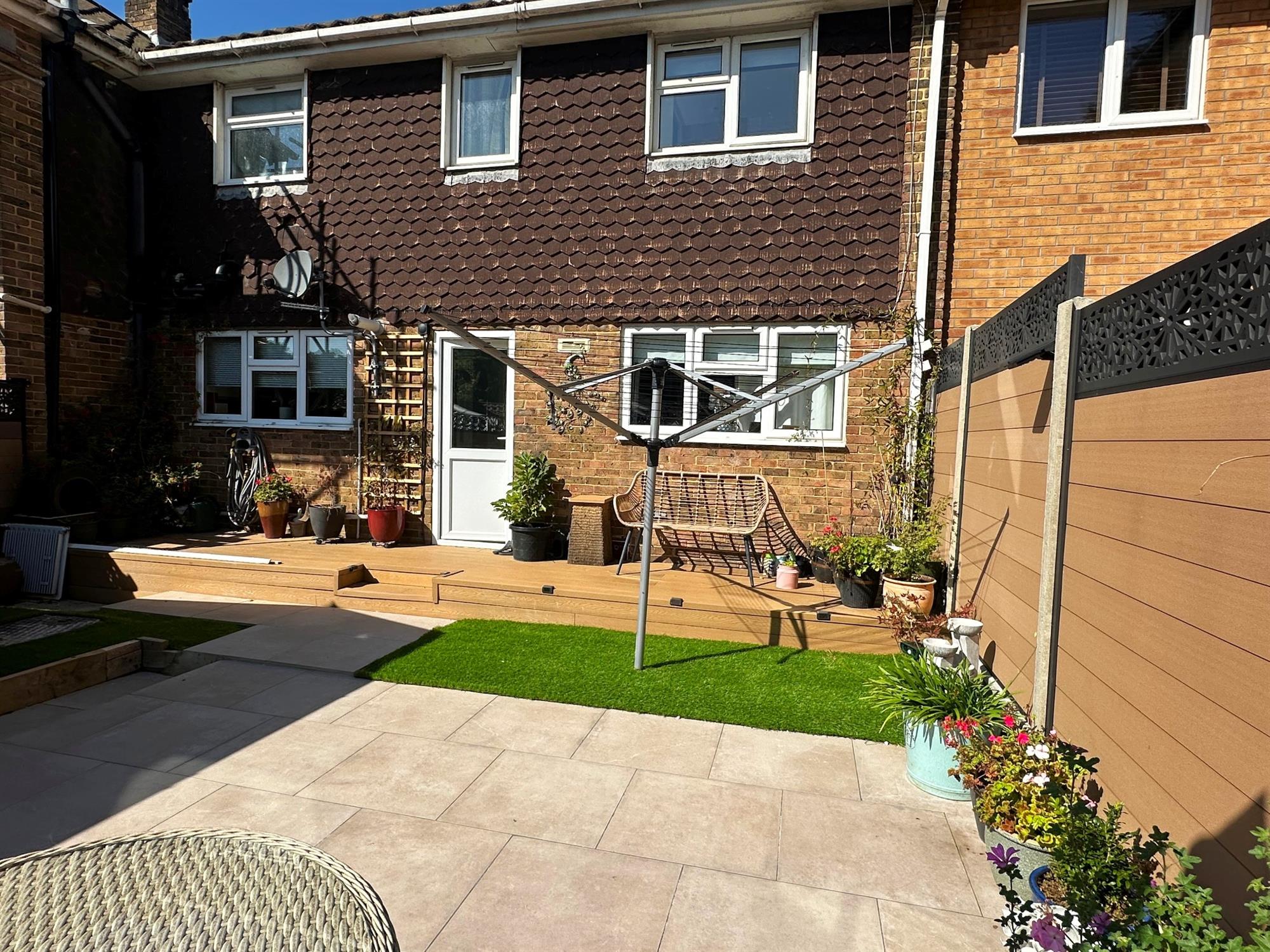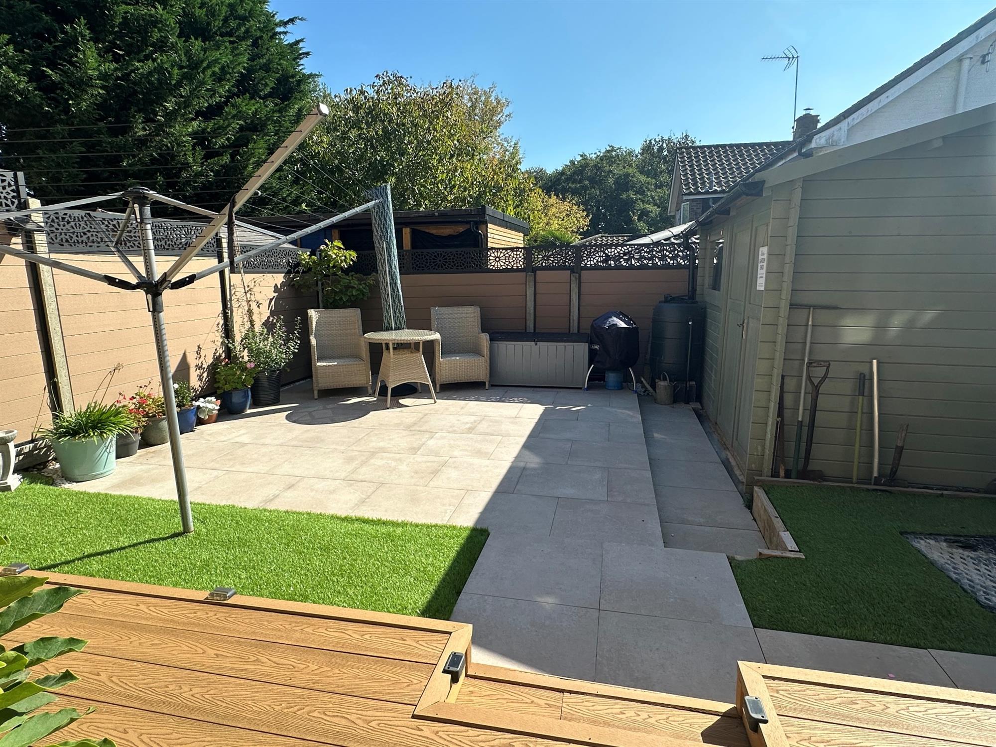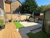 South facing. Fenced with Charles & Ivy composite fencing to boundaries. Porcelain patio area, raised composite decking, timber-built garden shred. Outside tap.