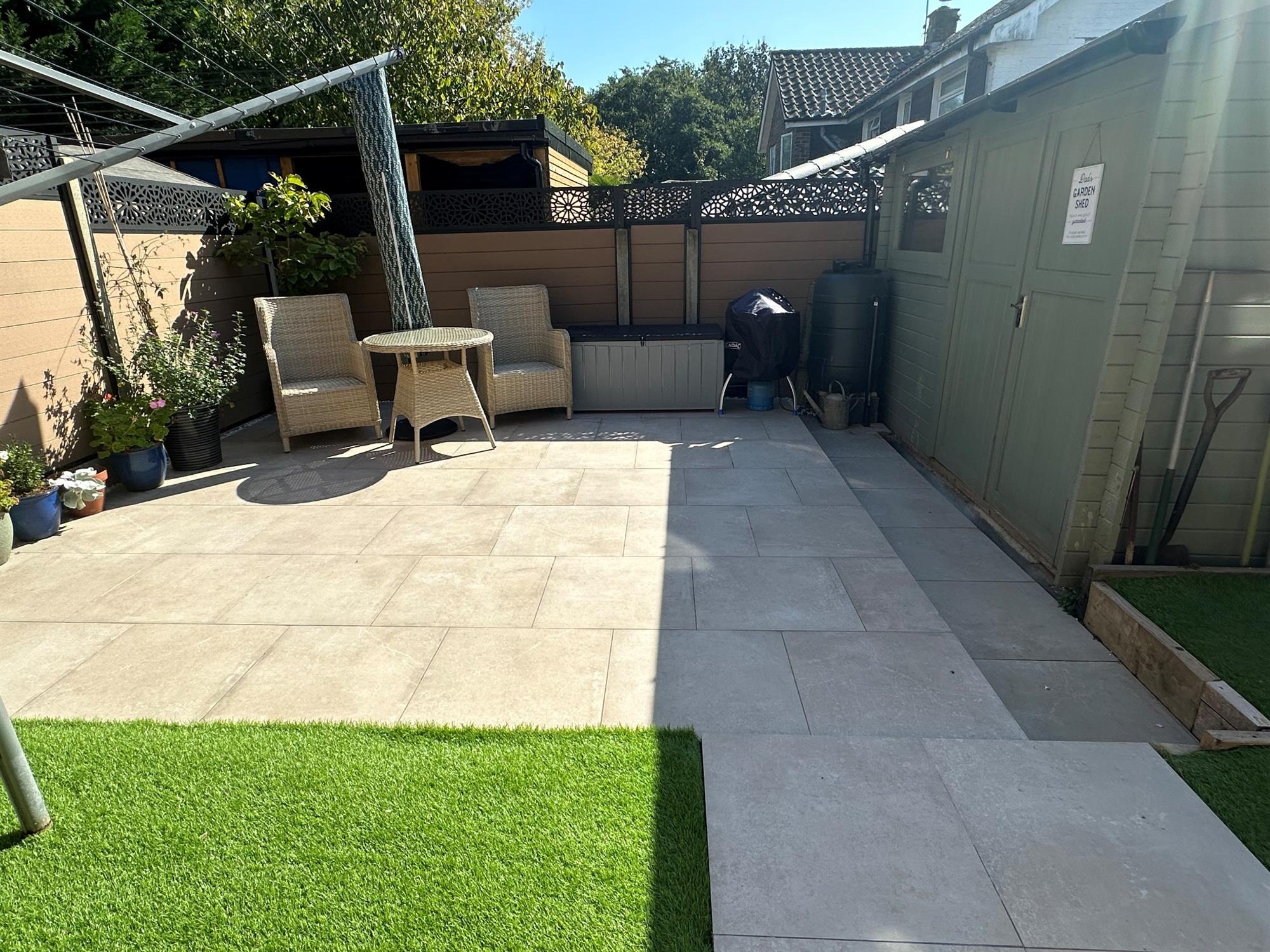 South facing. Fenced with Charles & Ivy composite fencing to boundaries. Porcelain patio area. Raised composite decking. Timber-built garden shed. Outside tap.