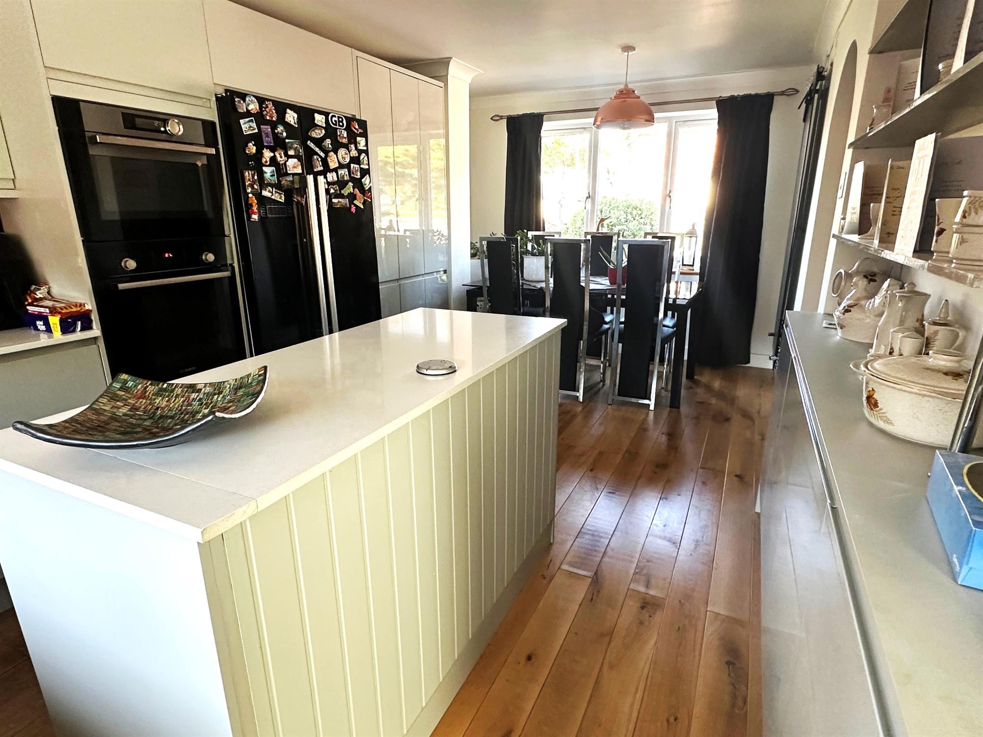 Double glazed windows to front and rear aspects. Engineered Oak flooring. Fitted with a comprehensive range of base and wall units with working surfaces over and tiling to splashbacks. Space for American Style fridge freezer. Built-in Bosch electric oven and De Diestrich combination microwave above. Inset induction hob with extractor hood over. Space and plumbing for washing machine and dishwasher. Inset sink with mixer taps. Island with space for a fridge and built-in cupboards below. Radiator. Opening to: