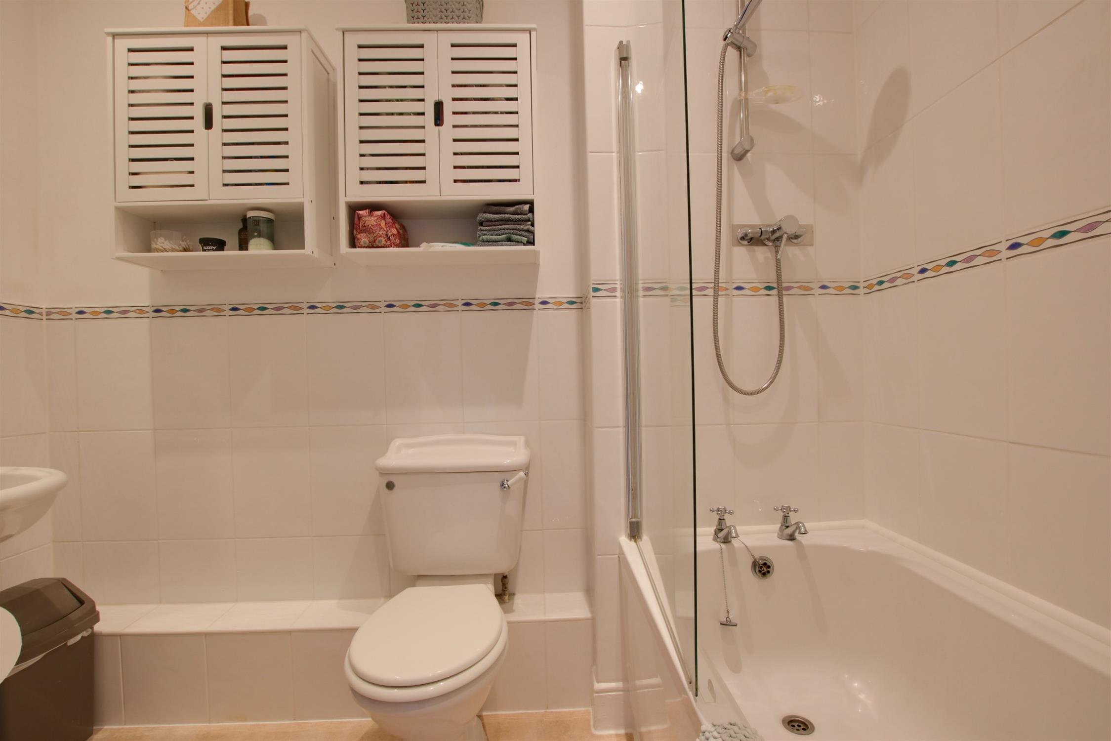 Panel enclosed bath with shower unit over and shower screen. Low level close coupled WC. Pedestal wash hand basin. Part tiled walls. Extractor fan. Inset ceiling spotlights.