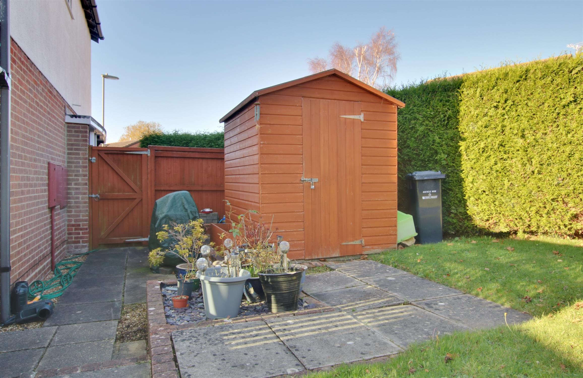 The rear garden is mostly laid to lawn with mature shrubs and trees. There is a garden shed and access to the street from the side of the house. In addition, there is a fenced, paved side courtyard area for bin storage and kitchen access. To the front of the house is a brick block paved driveway and lawn.