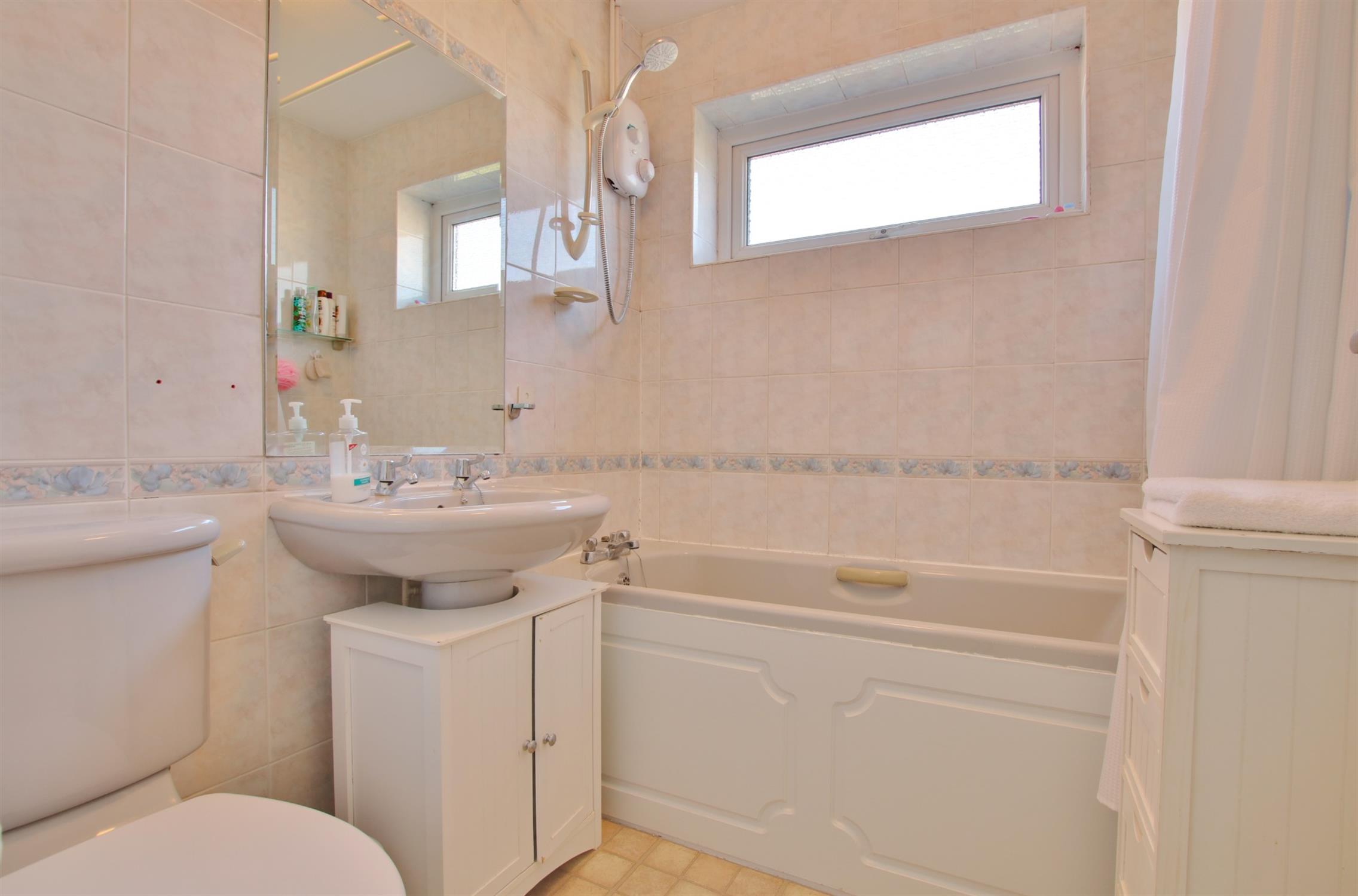 Tiled, panel bath with mixer tap, overhead Mira shower unit, WC, wash hand basin with storage cupboards below and mirror above, radiator, window.