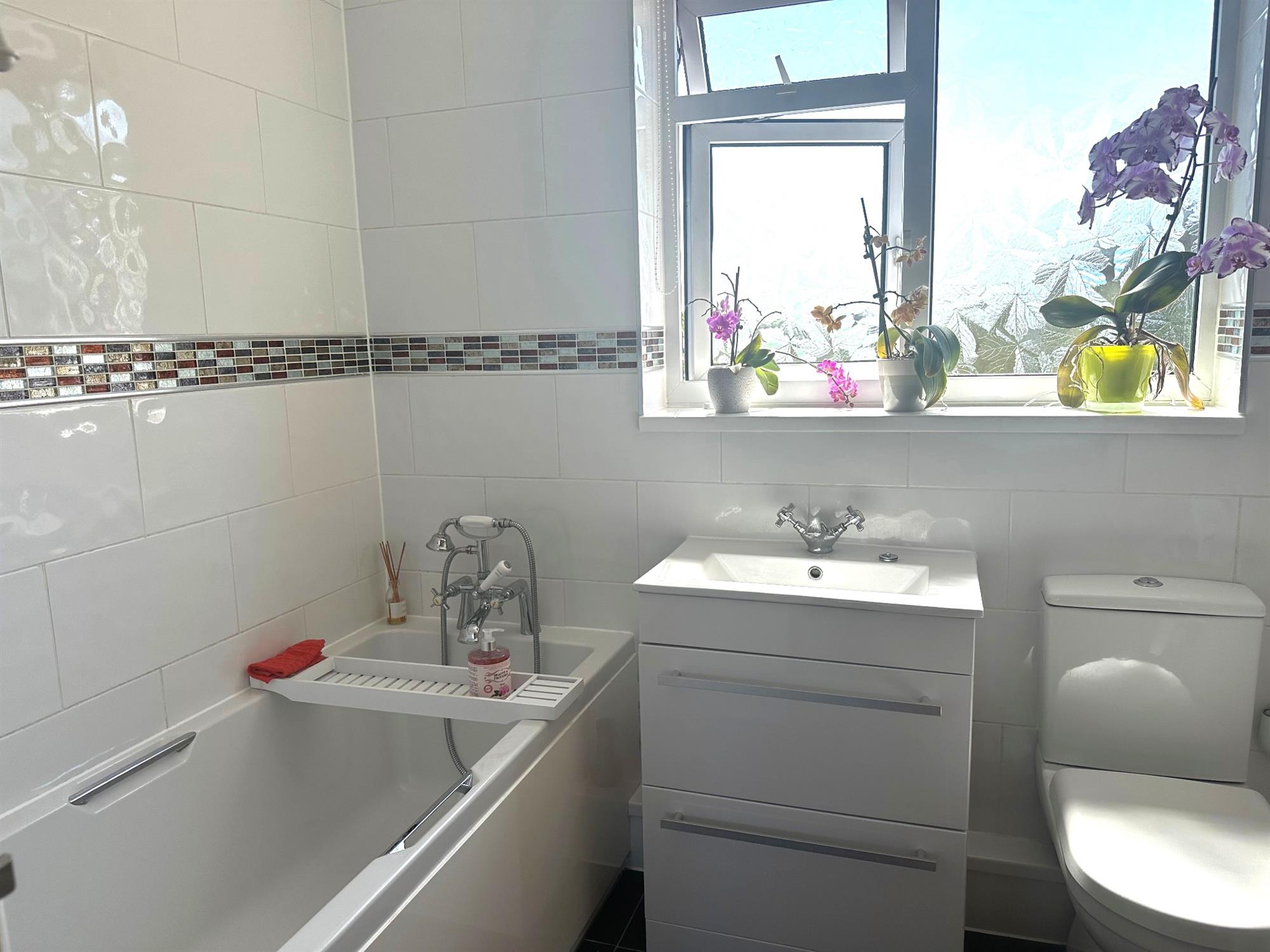 Comprising a white suite of panelled bath with mixer taps and shower attachment. Wash hand basin with built-in drawers below. Close coupled WC. Ceramic tiled flooring. Complimentary wall tiling. Chrome heated towel radiator.