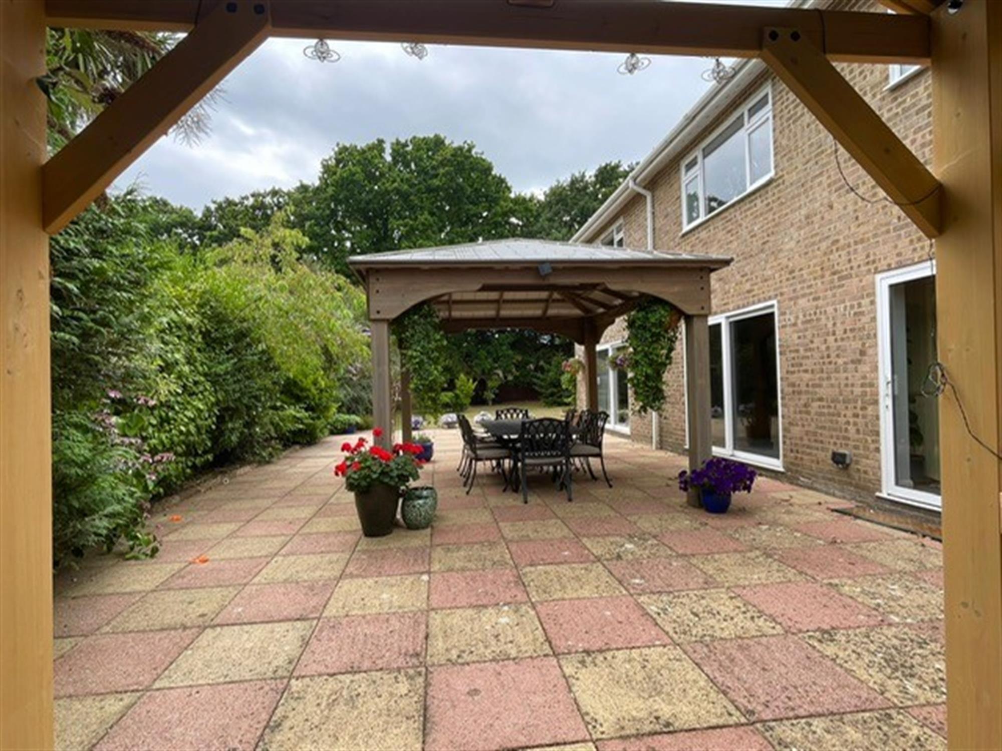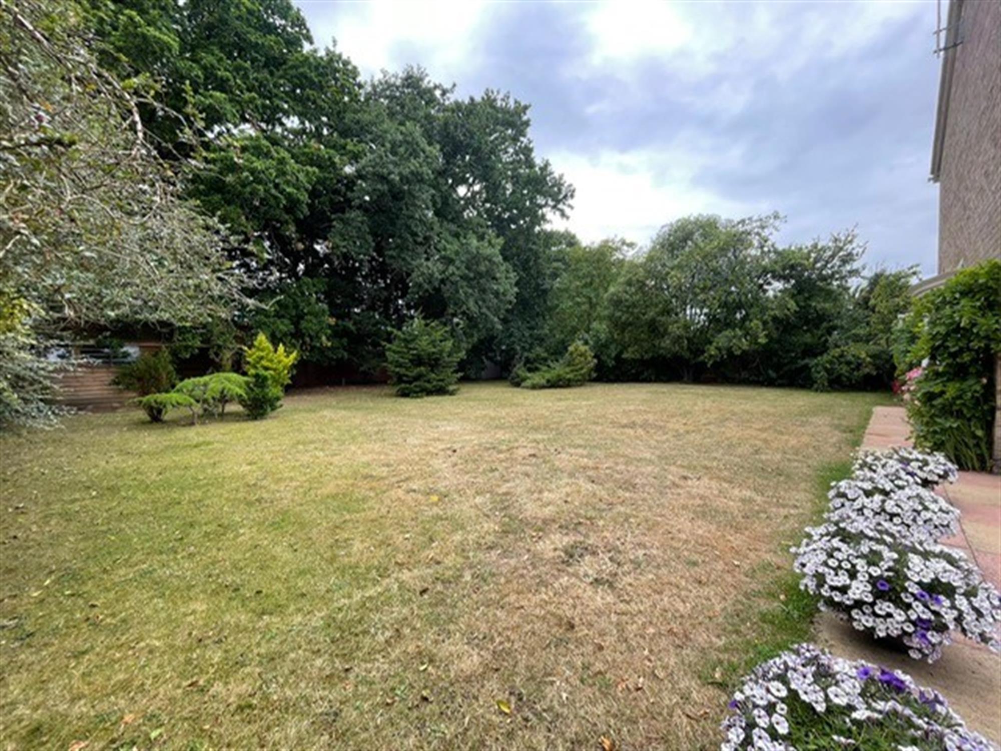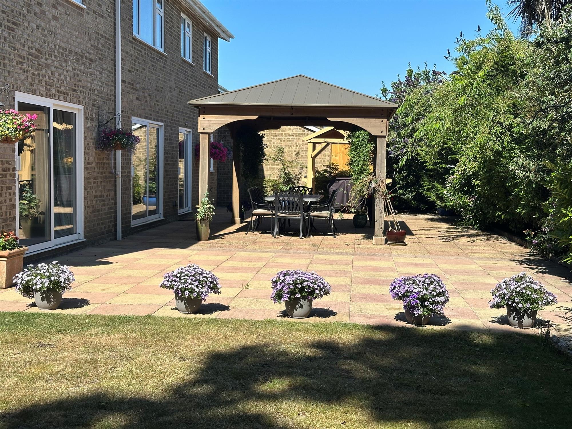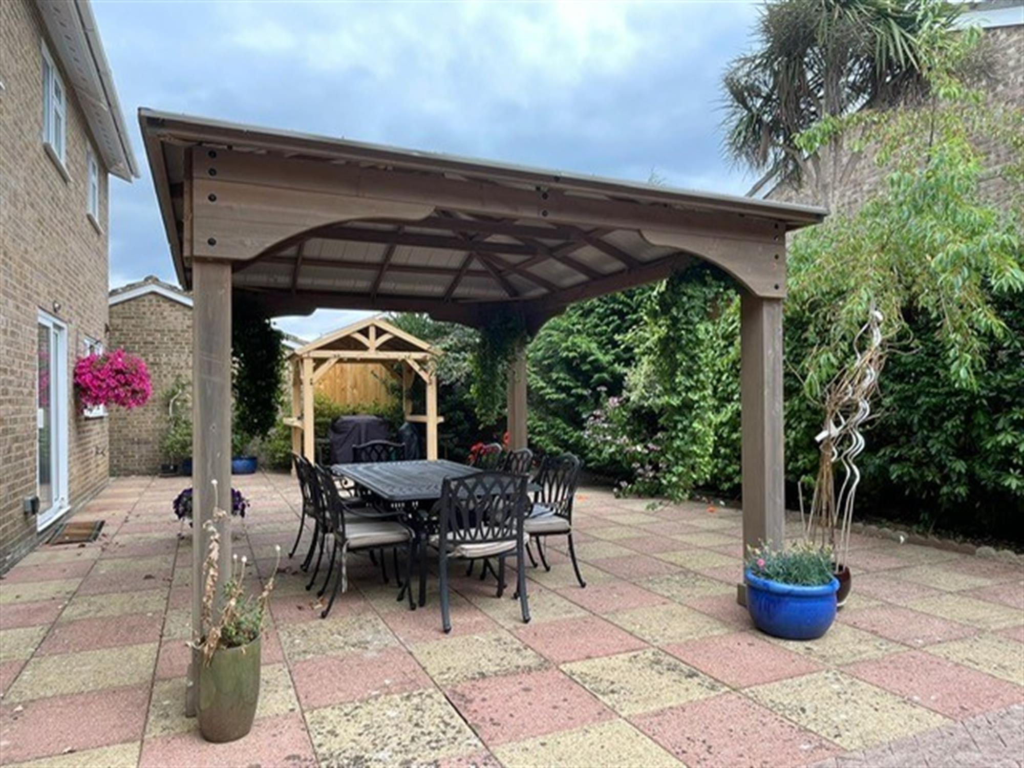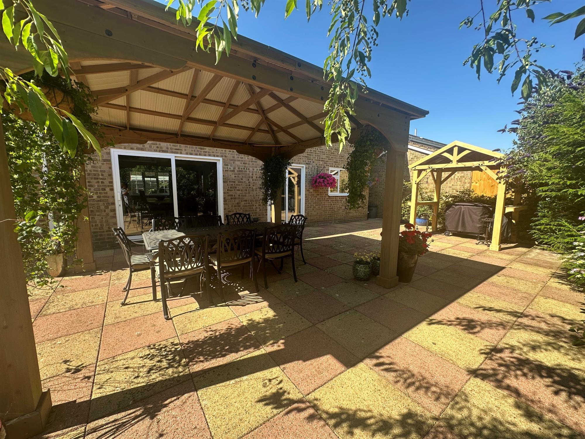 The south-facing garden has fencing and mature shrubs, trees and bushed to boundaries. Laid to lawn. Large patio area. Outside tap and outside power point. Timber shed with wood store to side. Further garden shed.