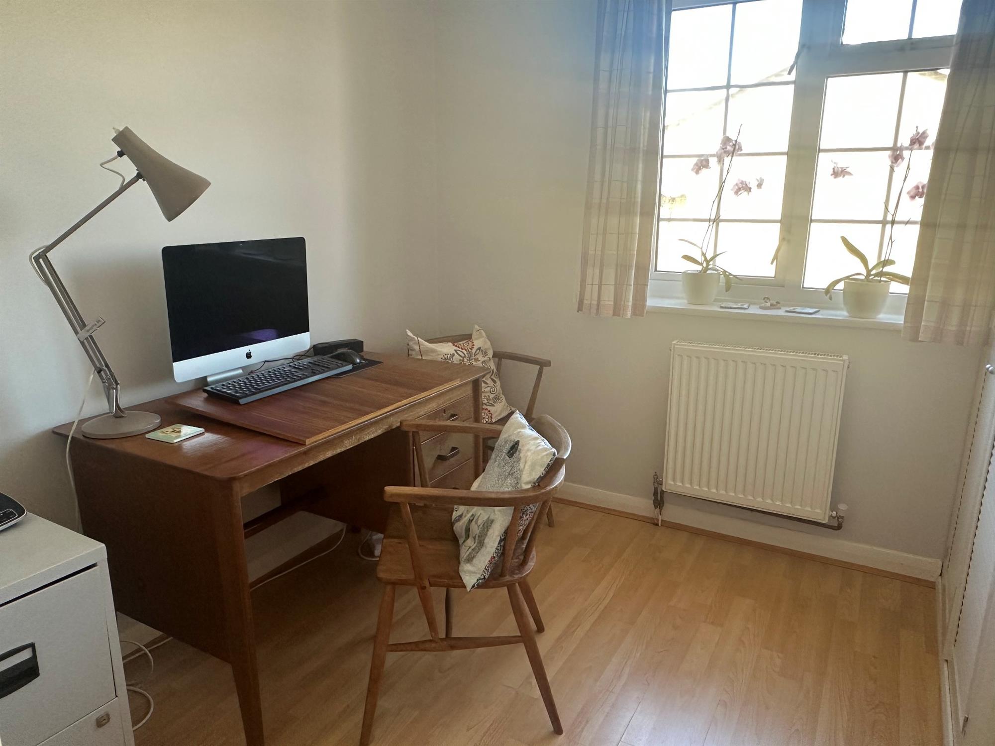 Double glazed Georgian style window to front aspect. Built-in double opening storage cupboard. Wood effect laminate flooring. Radiator.