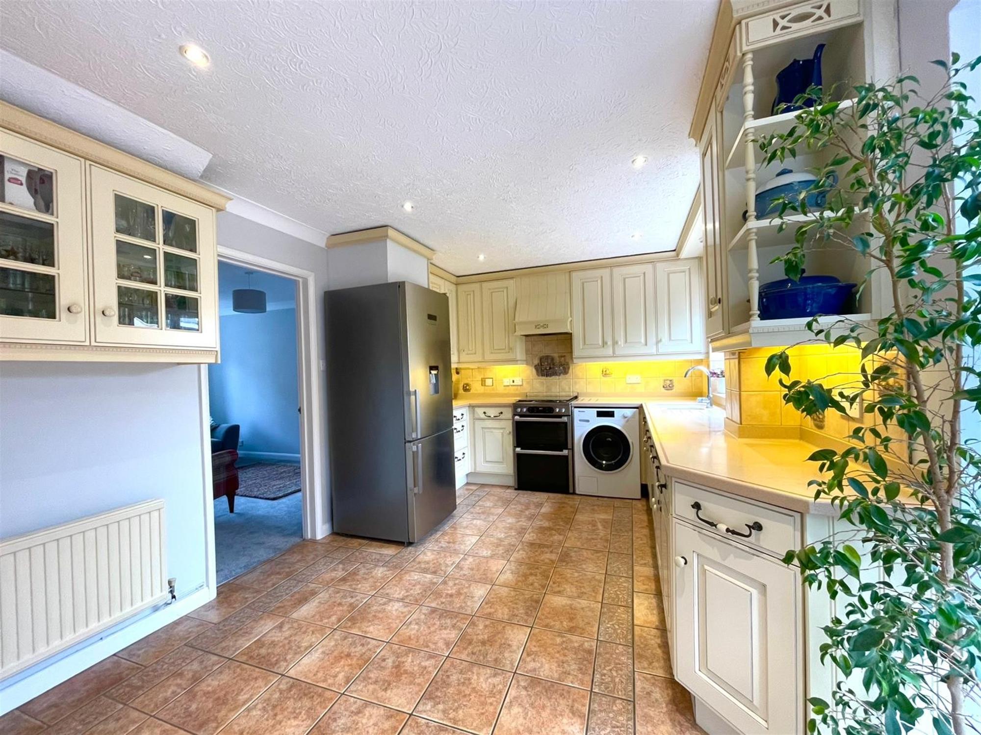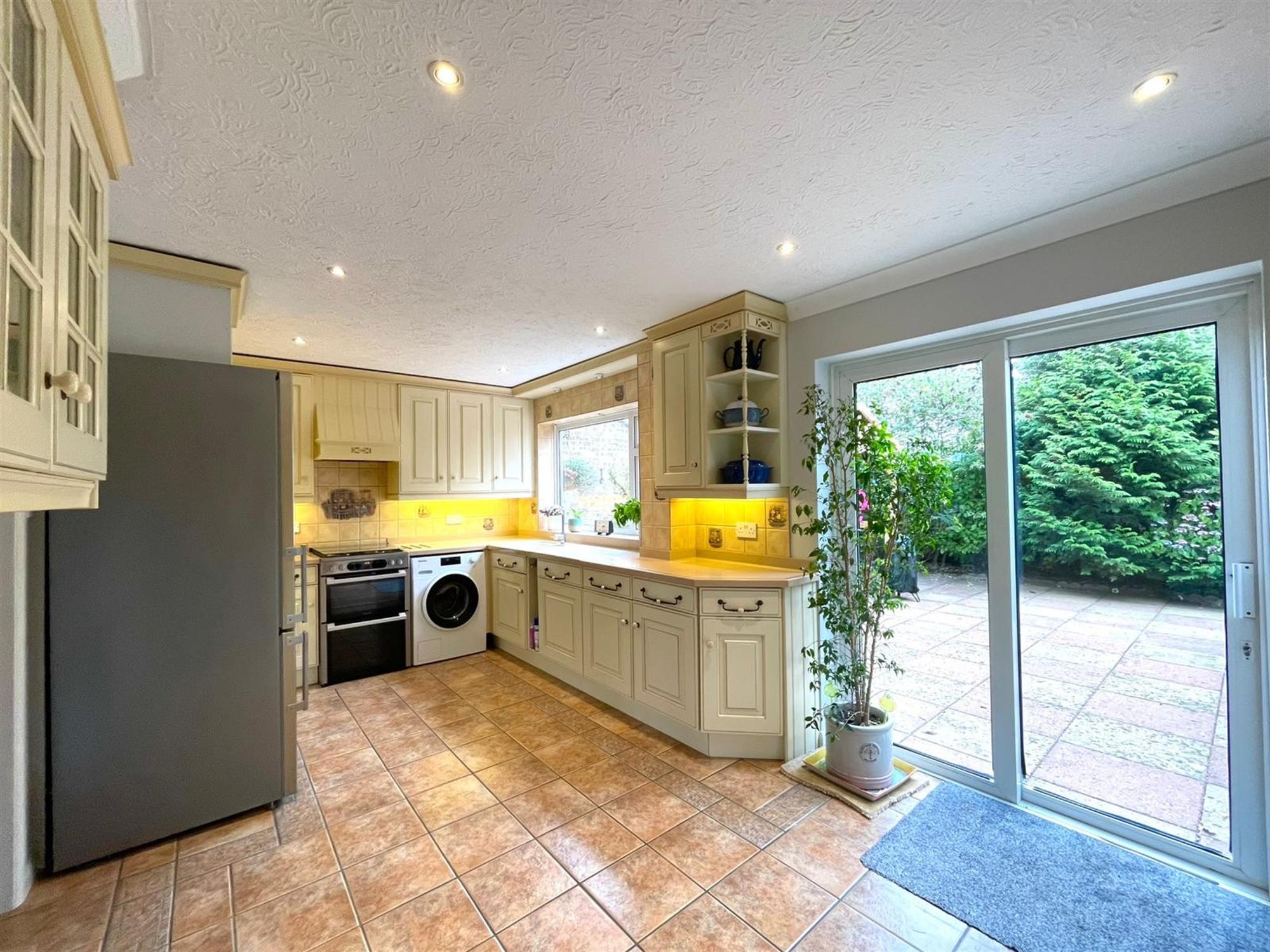 Double glazed window to rear. Double glazed patio doors to garden. Ceramic tiled flooring. Filed with a range of base and wall units with working surfaces over. Inset one and a half bowl sink unit with mixer tap. Space for cooker with extractor in canopy fitted over. Space and plumbing for washing machine. Integrated Neff dishwasher. Space for fridge/freezer. Dresser with display cabinets and storage. Radiator.