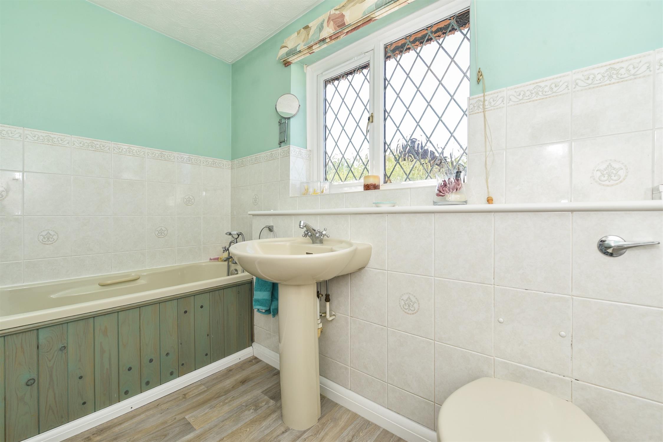 Suite comprising panelled bath with mixer tap and shower attachment, concealed cistern WC, vanity wash basin, tiling to principal areas, double glazed window to the rear, and radiator.