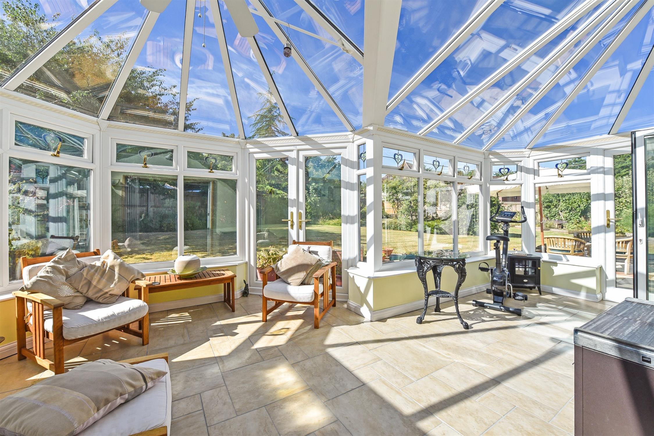 Brick base with double glazed elevations, pitched glazed roof, ceramic tiled floor, doors opening out to and overlooking the rear garden, wall mounted air conditioning unit.