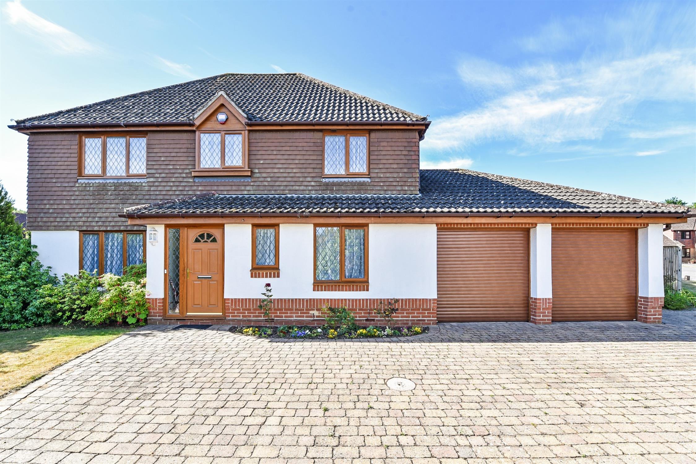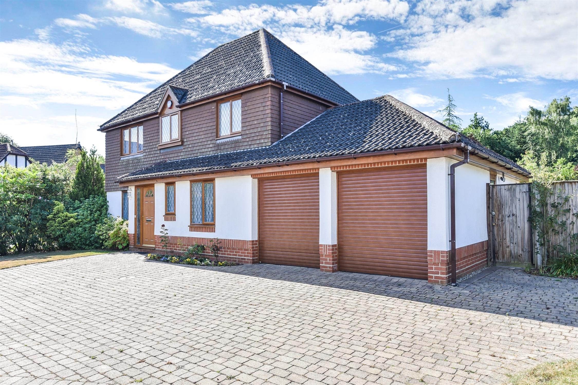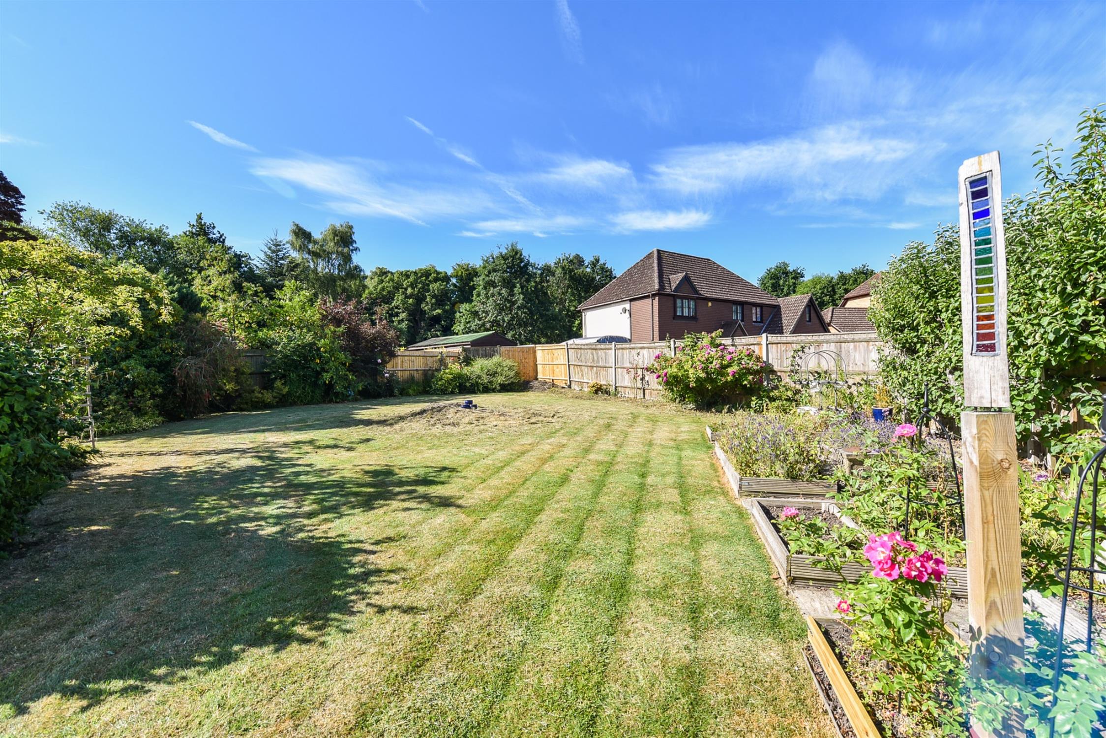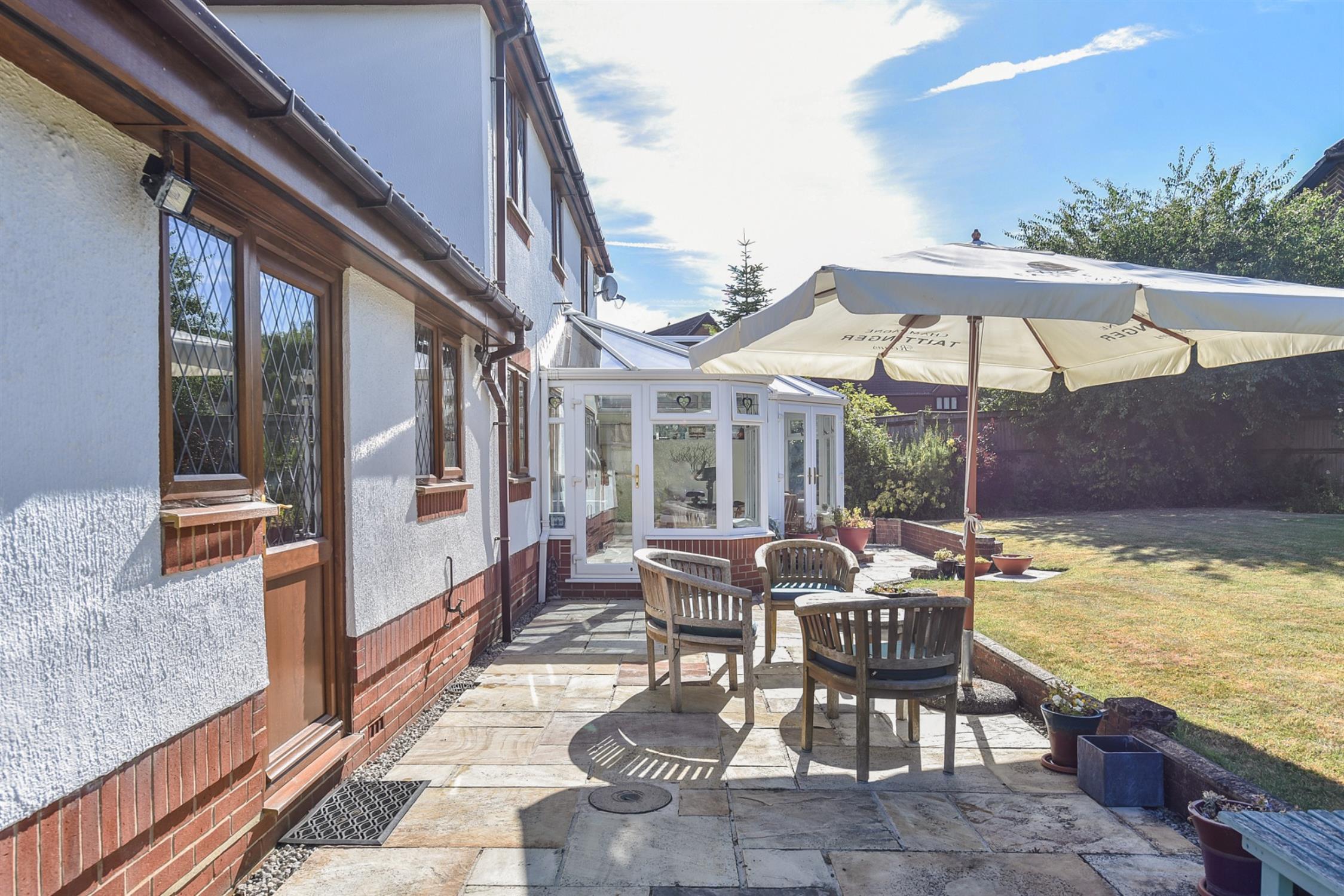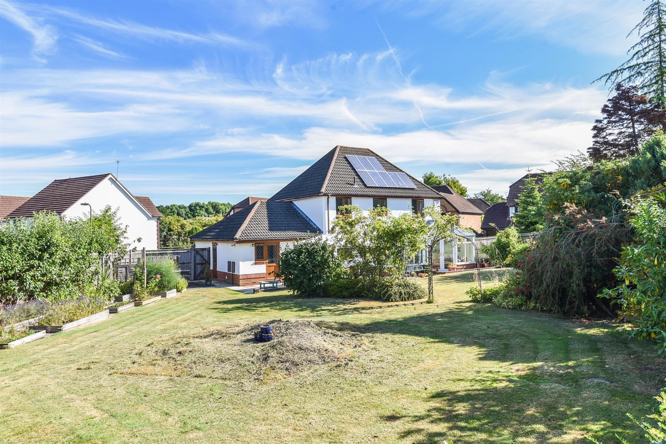 A well maintained southerly aspect garden with sweeping manicured lawns, well stocked flower and shrub borders, range of specimen trees, paved patio and seating areas, further areas of garden to the sides, timber garden shed, gate providing pedestrian access to the front and personal door to the garages.