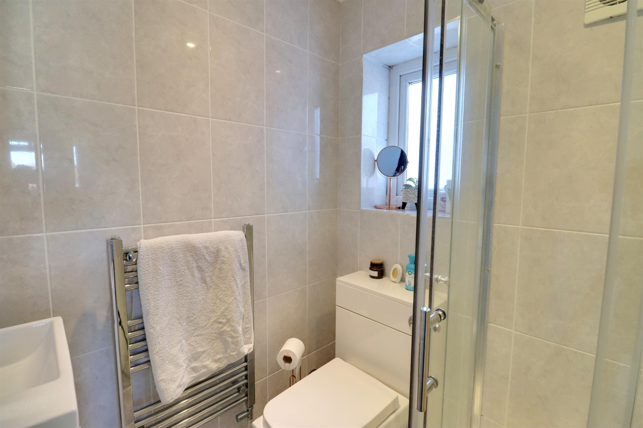 Fully tiled, side aspect double glazed window, heated towel rail, WC, wash hand basin, vanity unit and shower cubicle.