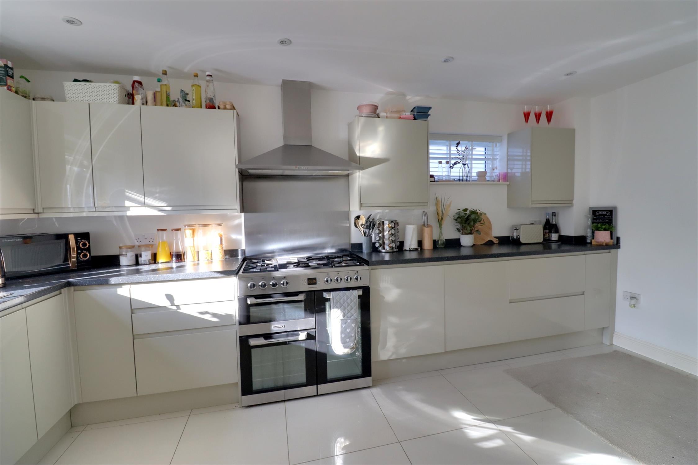 Fitted with a range of wall cupboards and base units to match, laminate worktops, double glazed windows to the front and side aspect, smooth ceiling, spot lighting, radiator, tiled flooring, one-and-a-half bowl stainless steel sink with mixer tap and drainer, built-in fridge and freezer, dishwasher and extractor hood, and a range style cooker.
