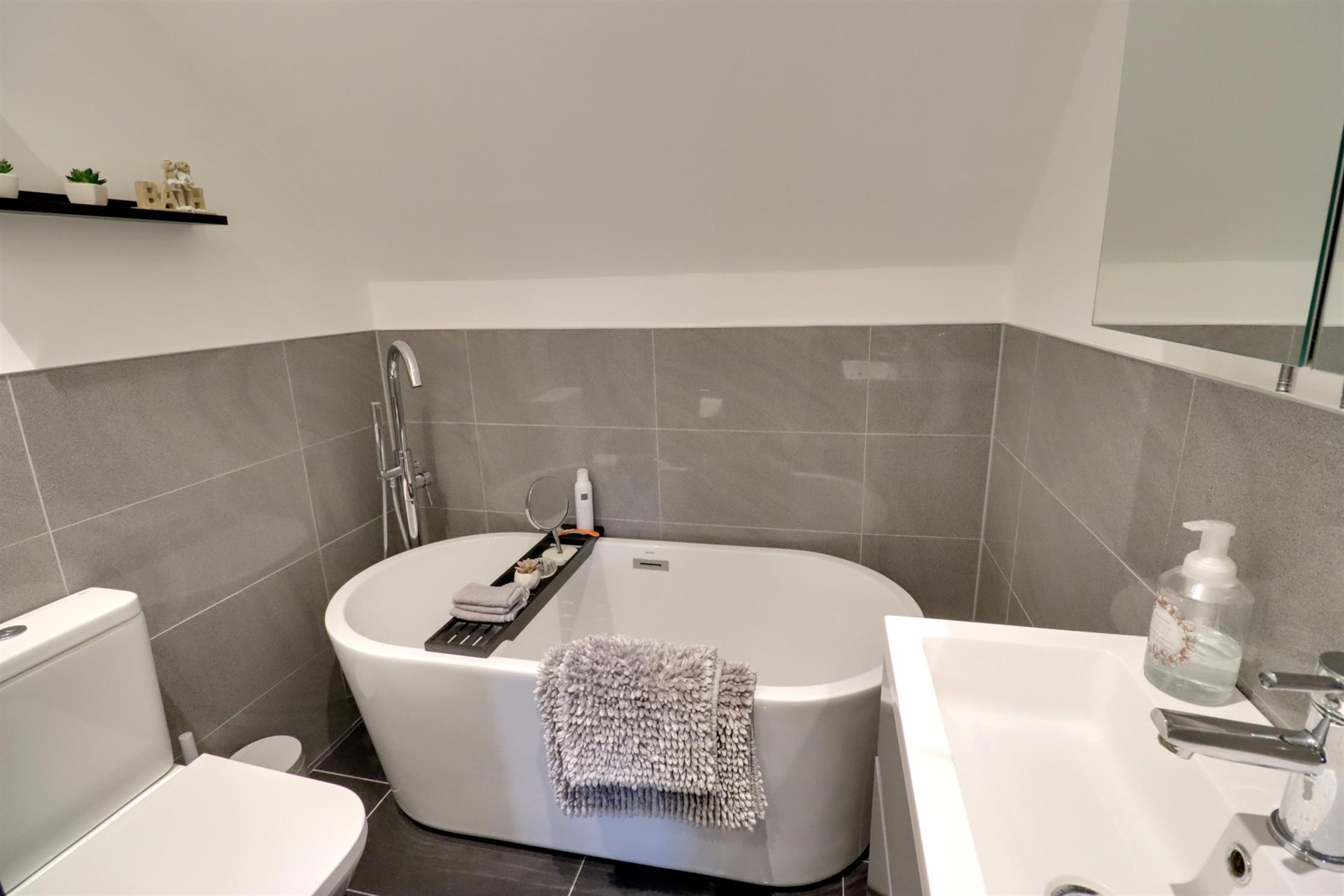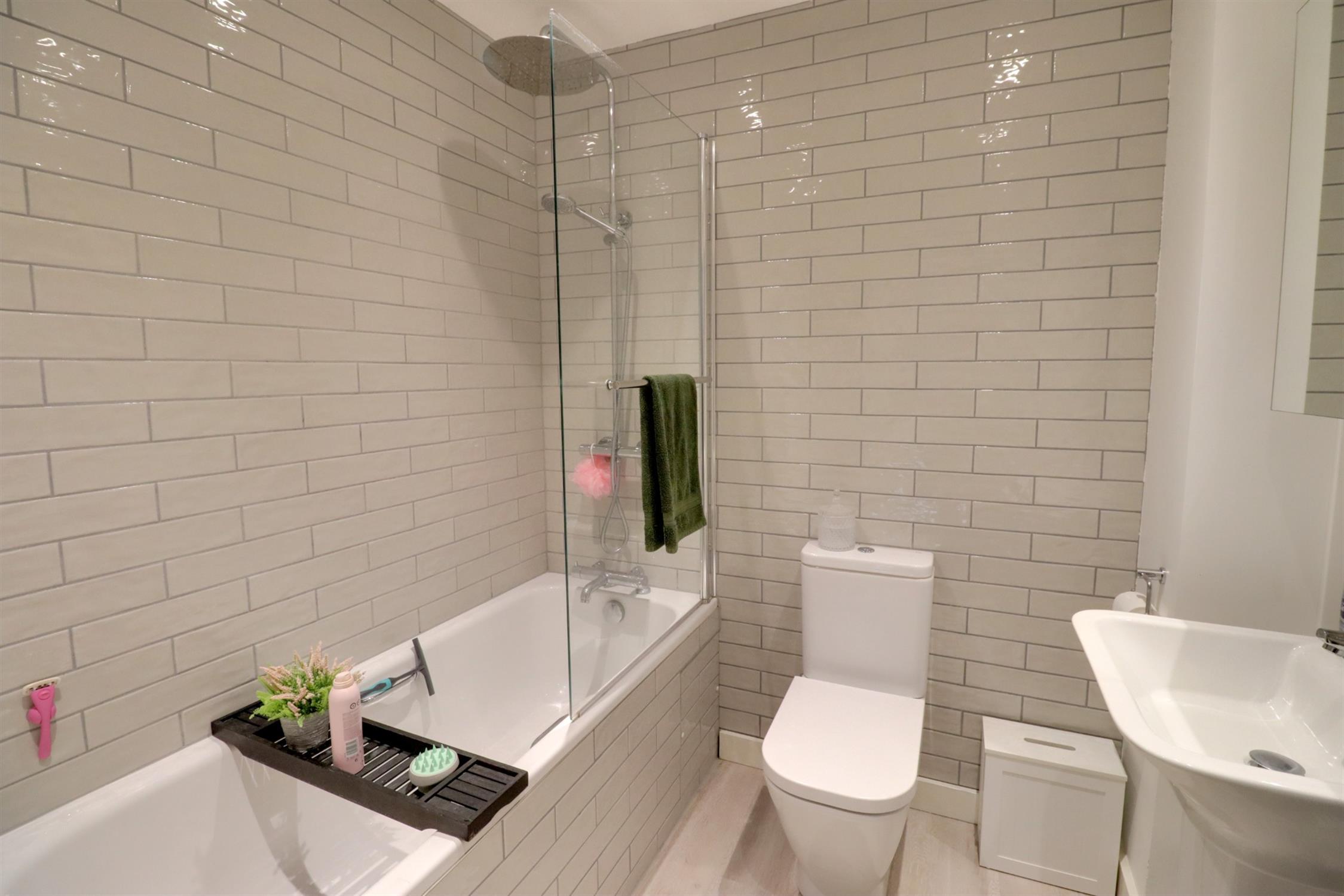 Re-fitted modern suite with panel enclosed bath with twin shower heads over, low level WC, wash basin in pedestal, heated towel rail.