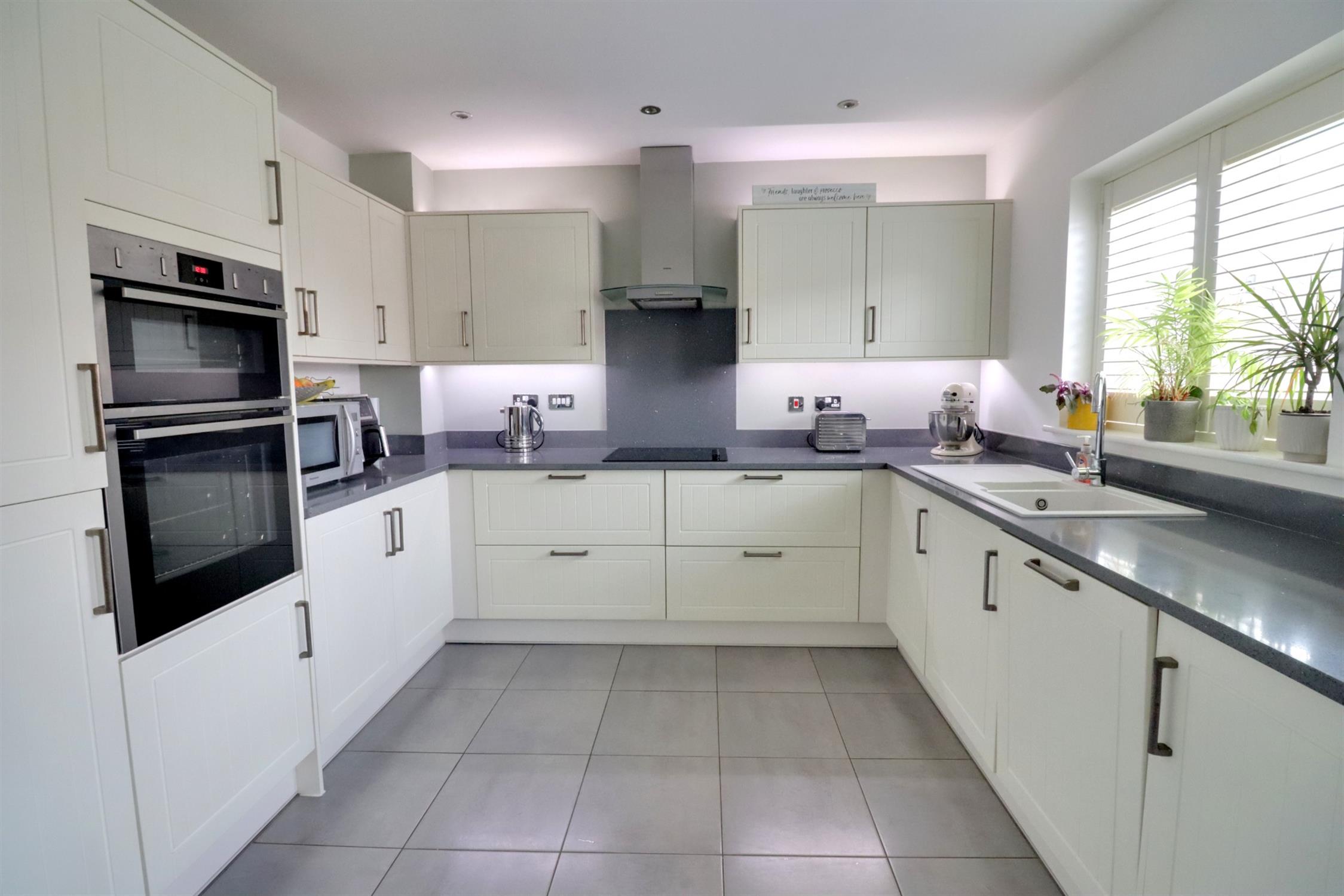 Modern kitchen with a range of matching wall and base units with Quartz worksurfaces over, integral electric double oven, integral electric hob with extractor hood over, integral dishwasher, plumbing for washing machine, inset one and half bowl sink and drainer, tiled flooring, two rear aspect double glazed windows with fitted shutters, rear aspect double glazed door leading to the rear garden.