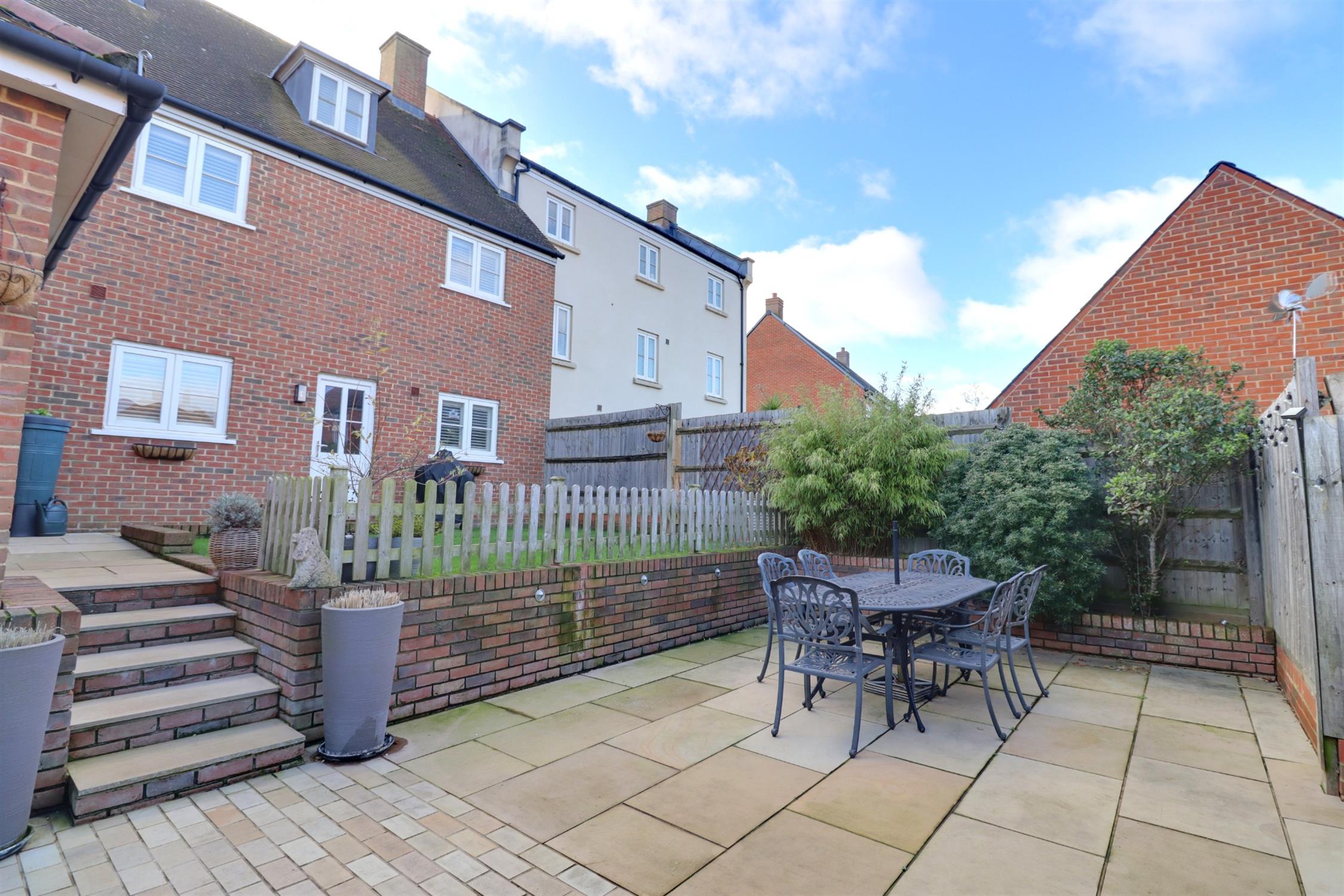 An attractive and landscaped space enclosed by fence, lawns with steps down to a large patio area with raised borders, side door to the tandem garage.