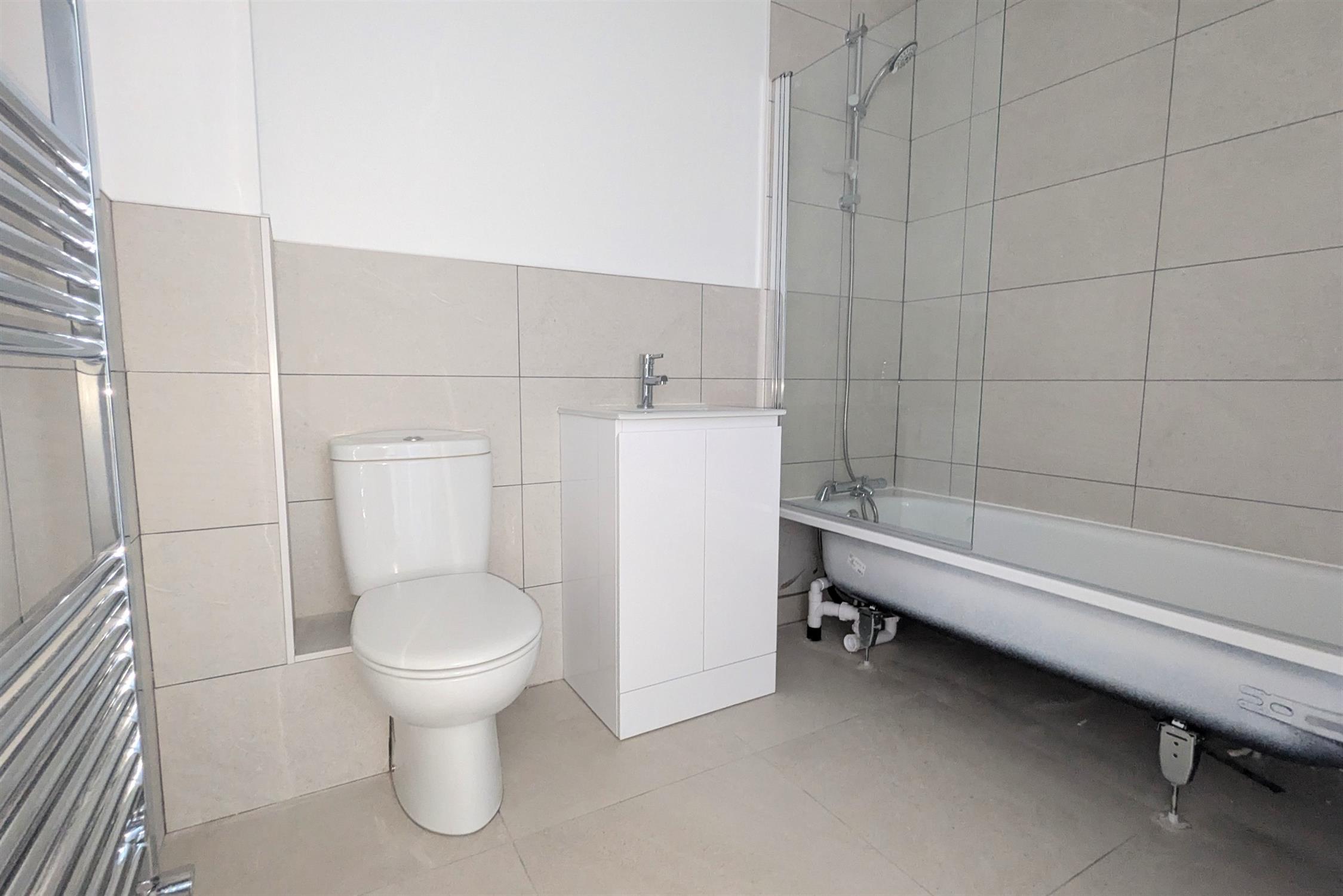 BATHROOM: 2.35m x 1.73m (7'8" x 5'8") Modern white WC, wash hand basin, bath with shower over and heated towel rail.