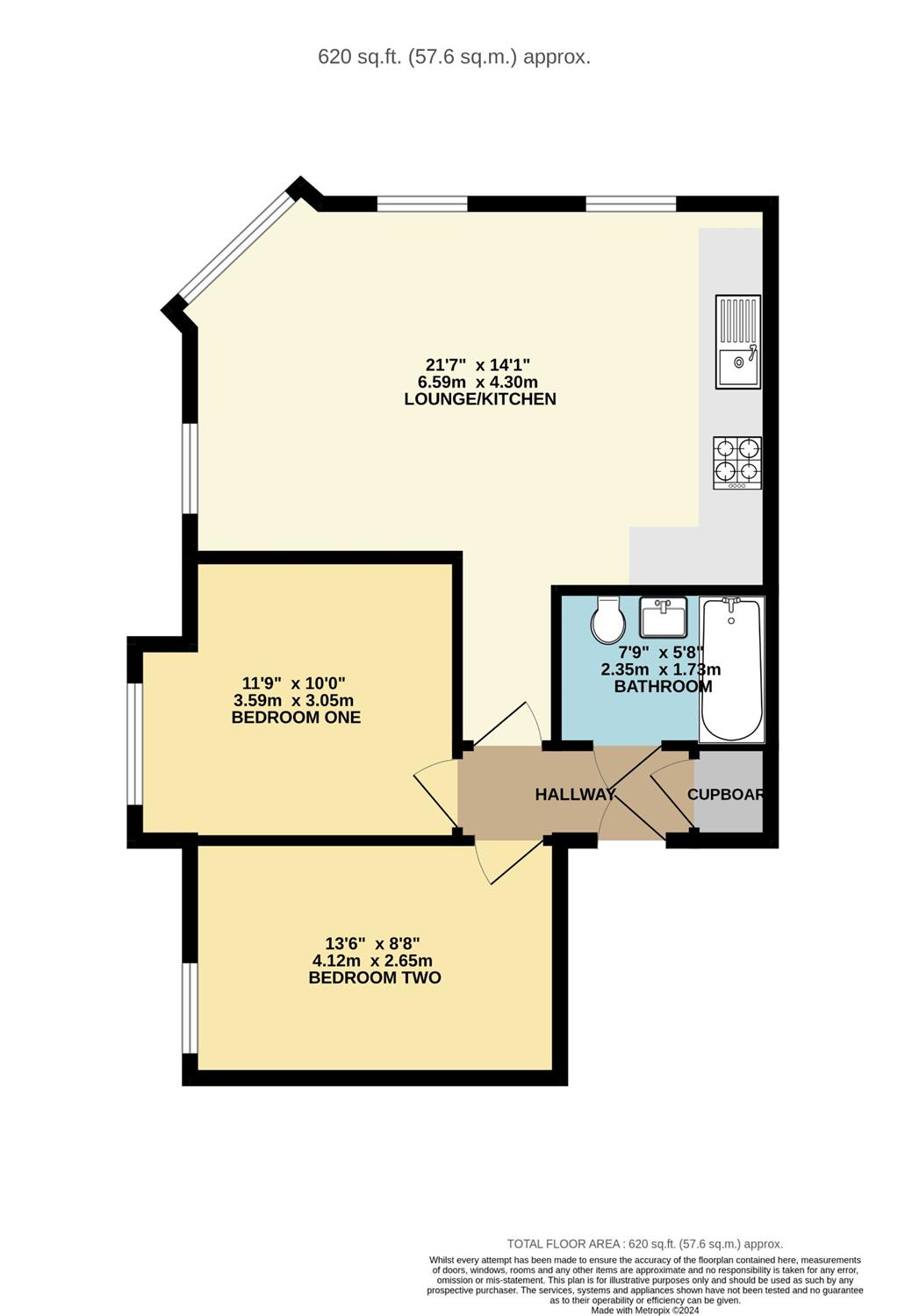 LOUNGE/KITCHEN: 6.59m x 4.3m (21'7" x 14'1") Open-plan living area with modern fitted kitchen units, five-ring gas hob, electric oven and integrated fridge freezer. Space and plumbing for washing machine.
