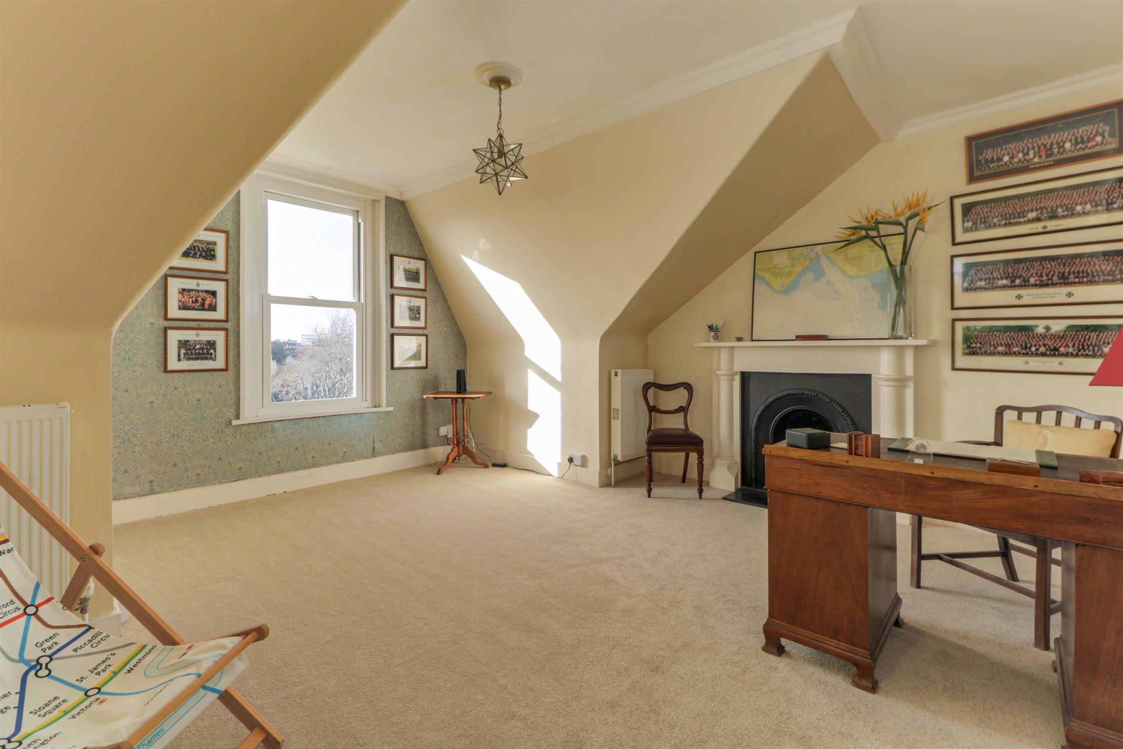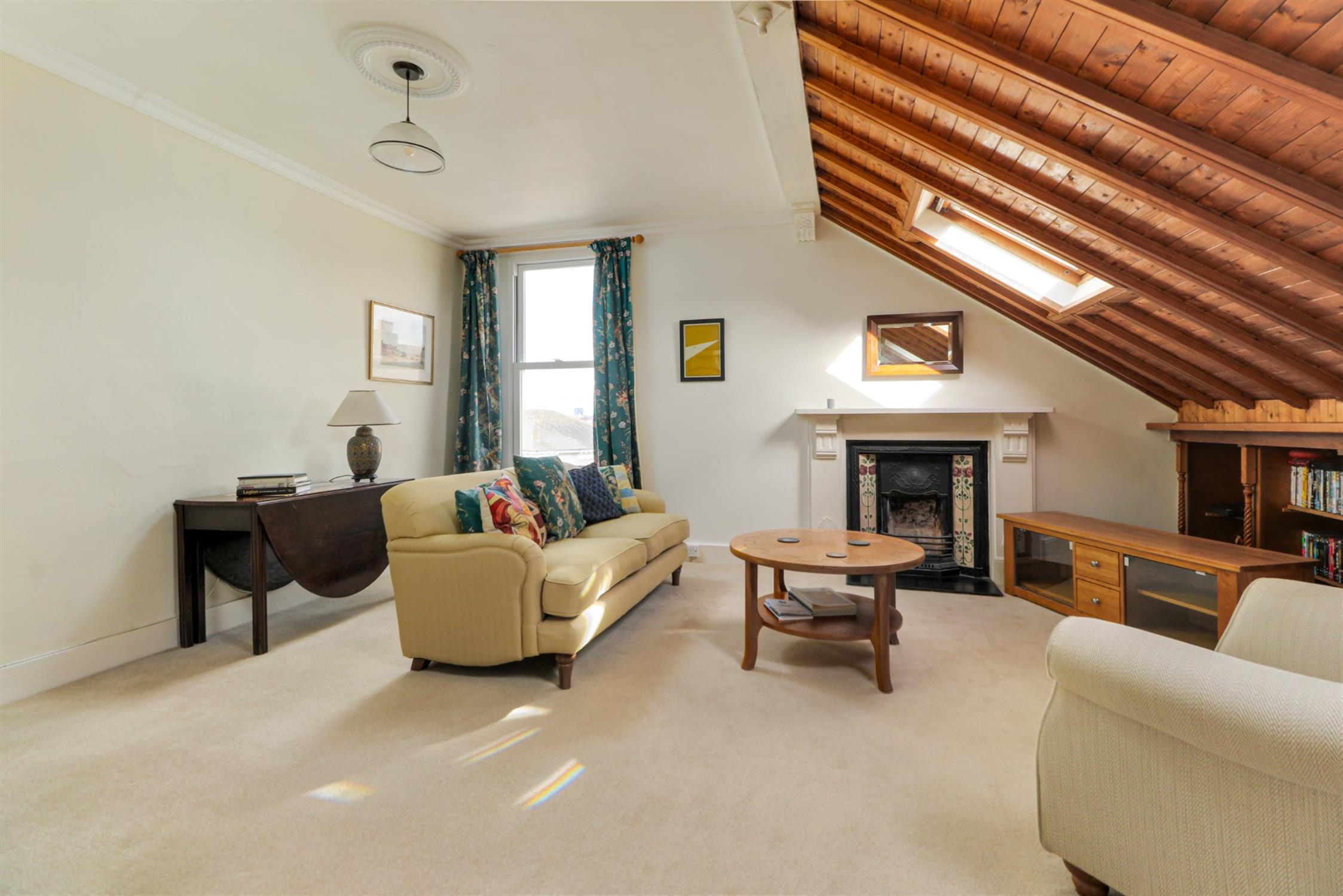 Smooth and coved ceiling, part vaulted ceiling, two Velux windows, double glazed sash window, period fire place, recessed shelving, radiator, fitted carpet.