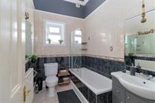 Smooth ceiling, inset spotlights, ornate cornicing, extractor fan, picture rails, obscured UPVC double-glazed window, bath with shower over, wash hand basin, tiled splash back, low level W.C, radiator and tiled flooring.