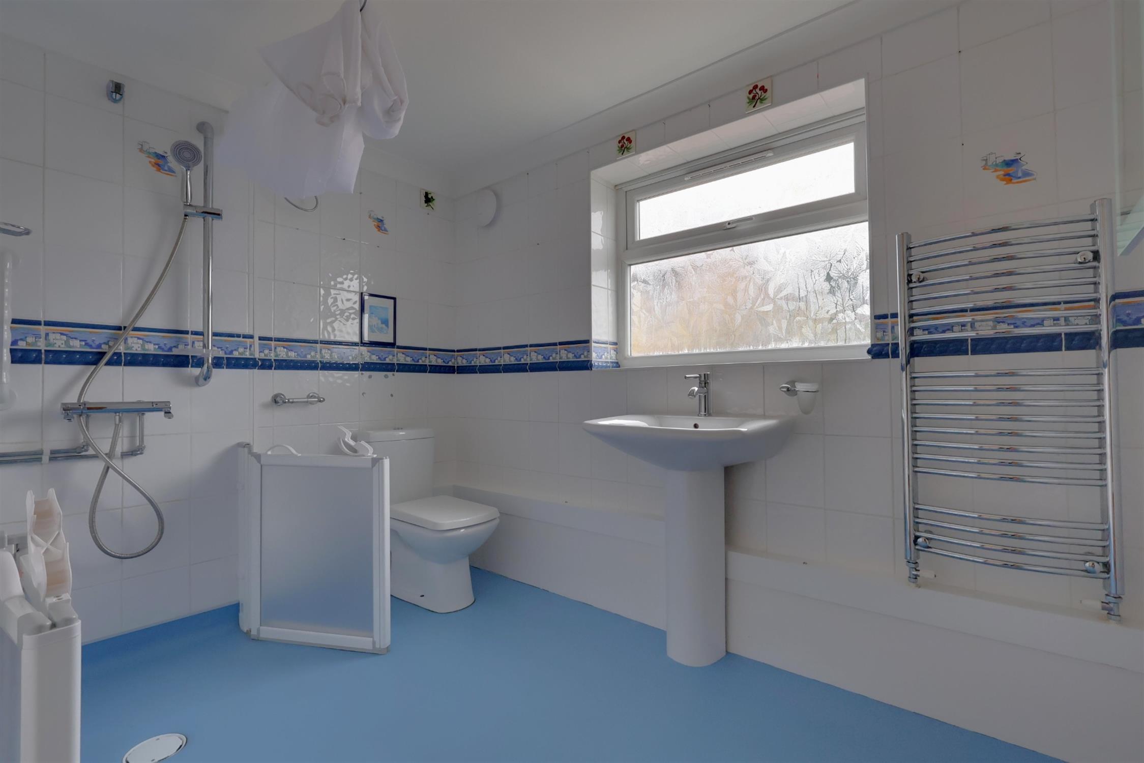 Shower attachment. WC. Ceramic sink. Heated towel rail. Frosted double glazed window.