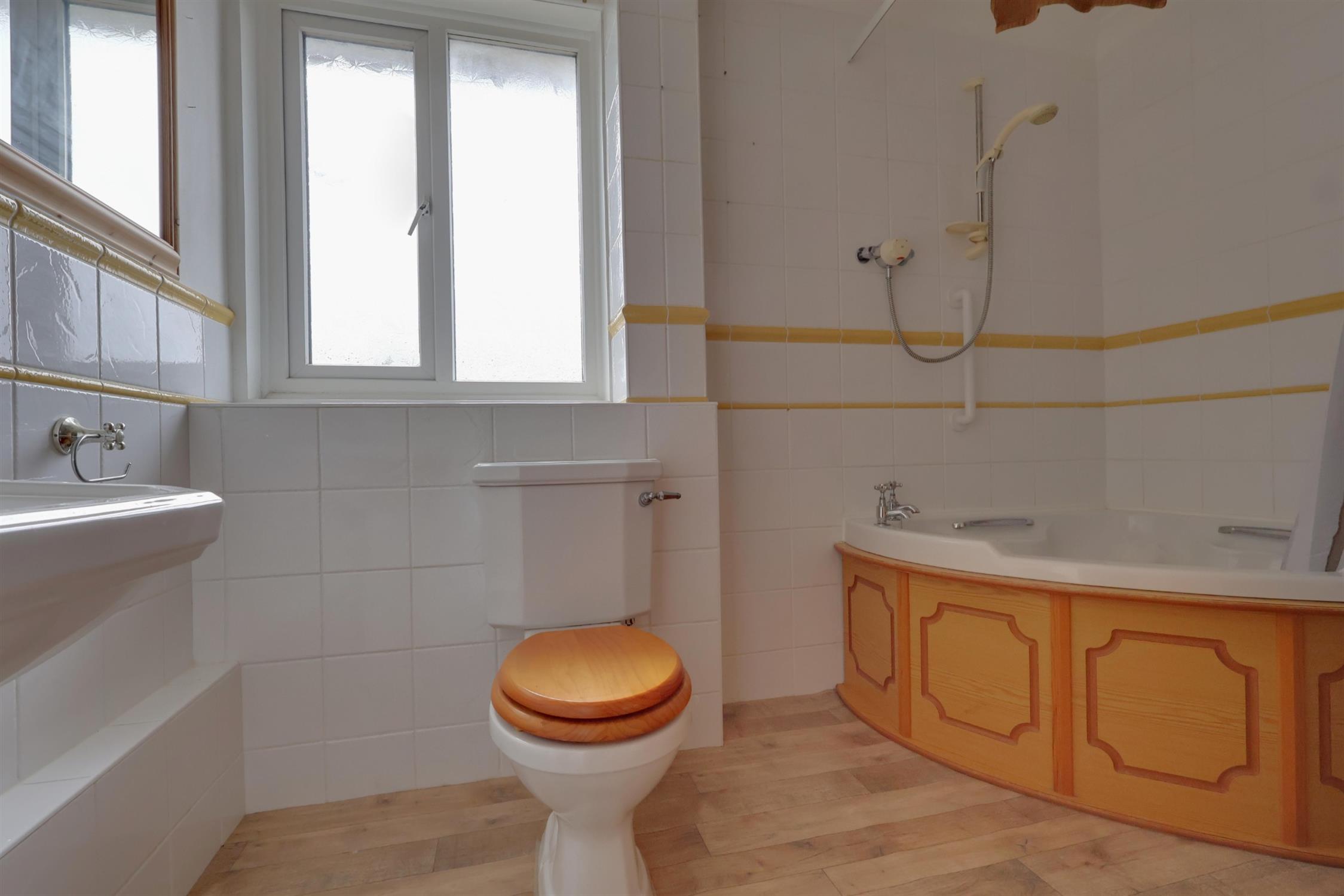 Panelled bath with shower attachment. WC. Ceramic sink. Radiator. Frosted double glazed window.