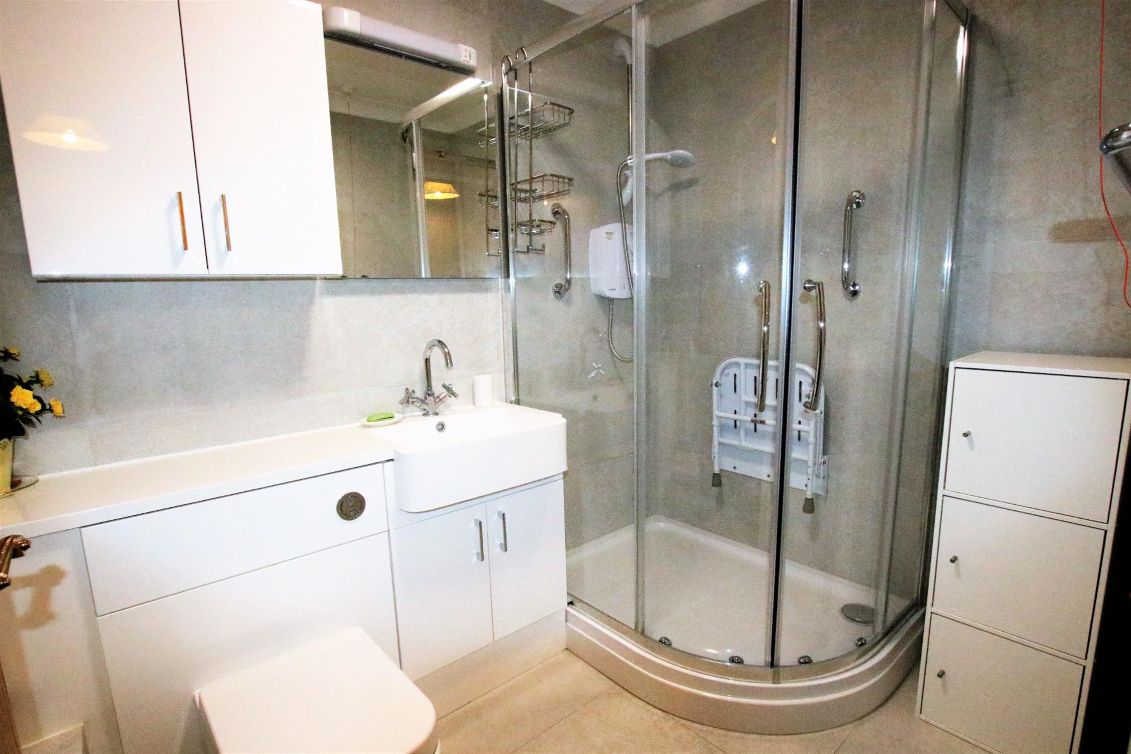 Re-fitted suite comprising of: walk in glazed shower enclosure, concealed cistern WC, wash basin with mixer tap and cupboards under, light and shaver point, extractor fan, dimplex eye level convector heater, fully tiled walls and flooring.
