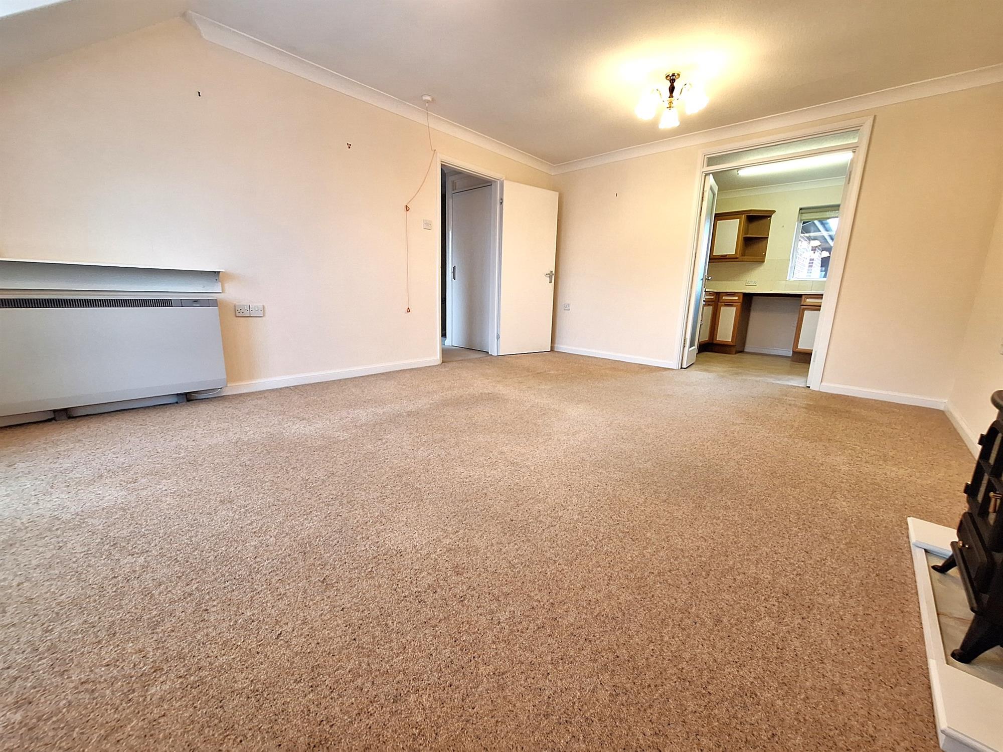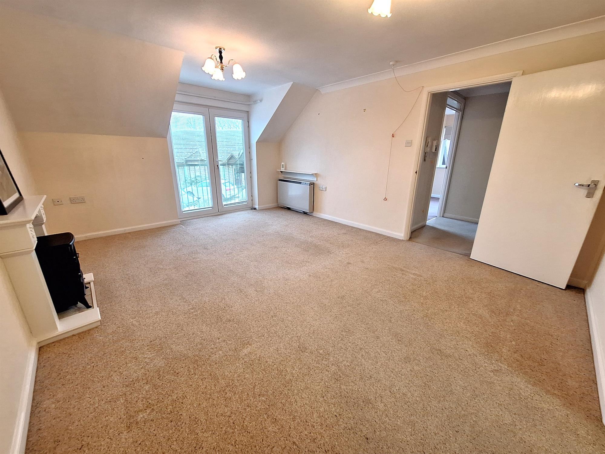 Double-glazed French doors to Juliet balcony overlooking the communal front aspect. Dimplex electric storage heater, electric fire with decorative timber surround, TV aerial point, emergency pull cord, door to: