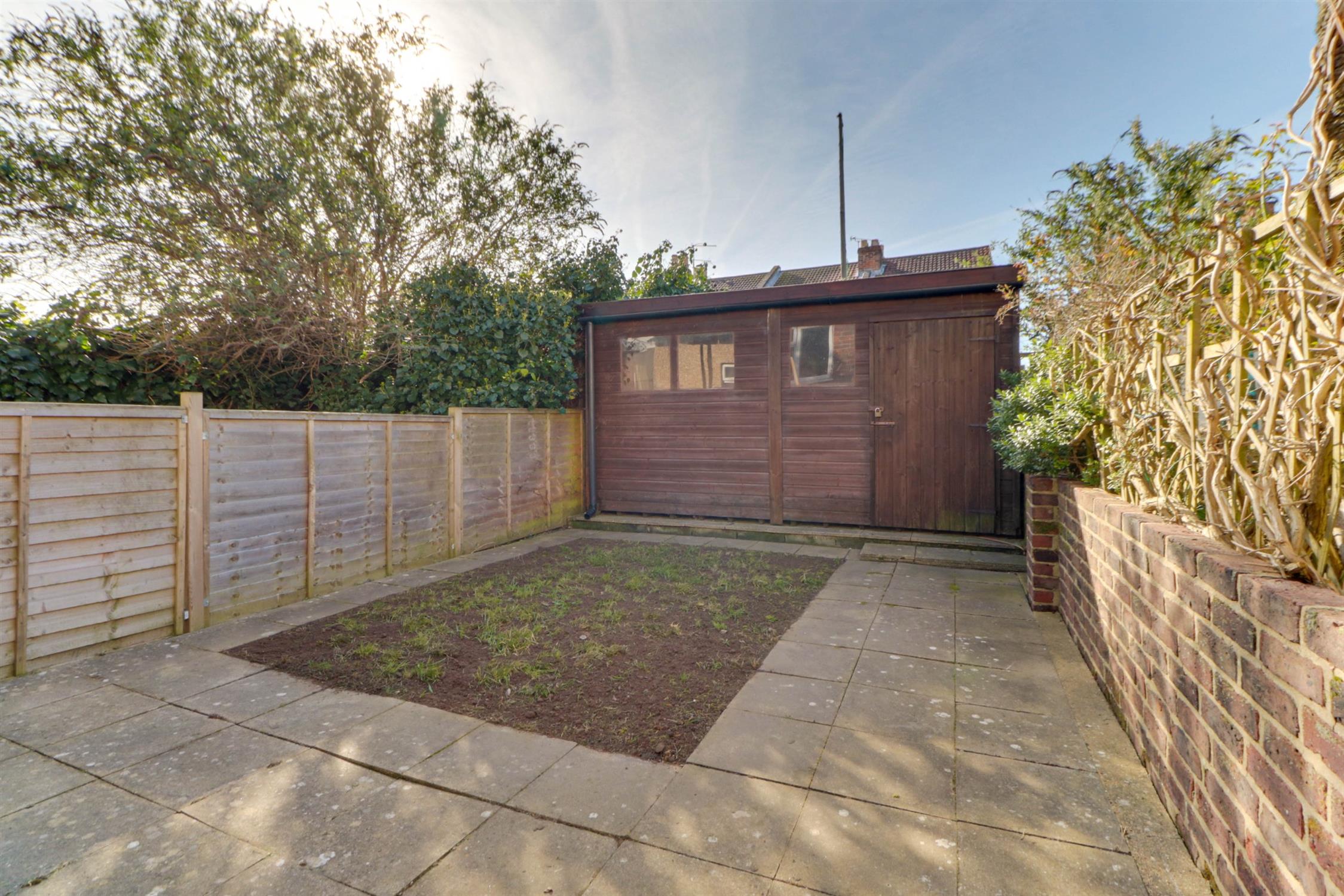 South facing, wall and fence enclosed rear garden, patio, lawn, large storage shed.
