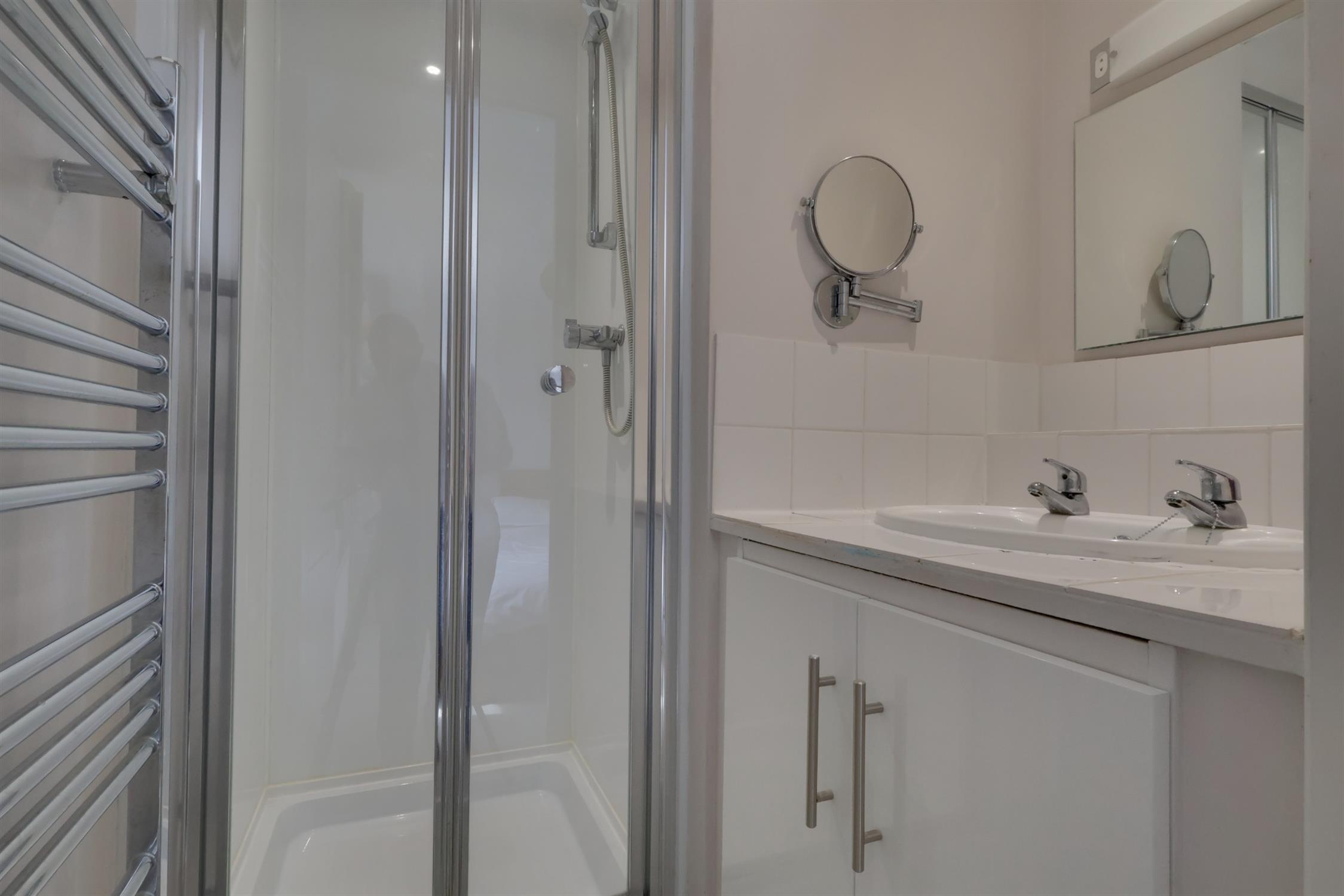 Separate shower cubicle with folding glass screen. Wash hand basin with tiled surround and splashback, with storage cupboards under. Ladder style heated towel rail.