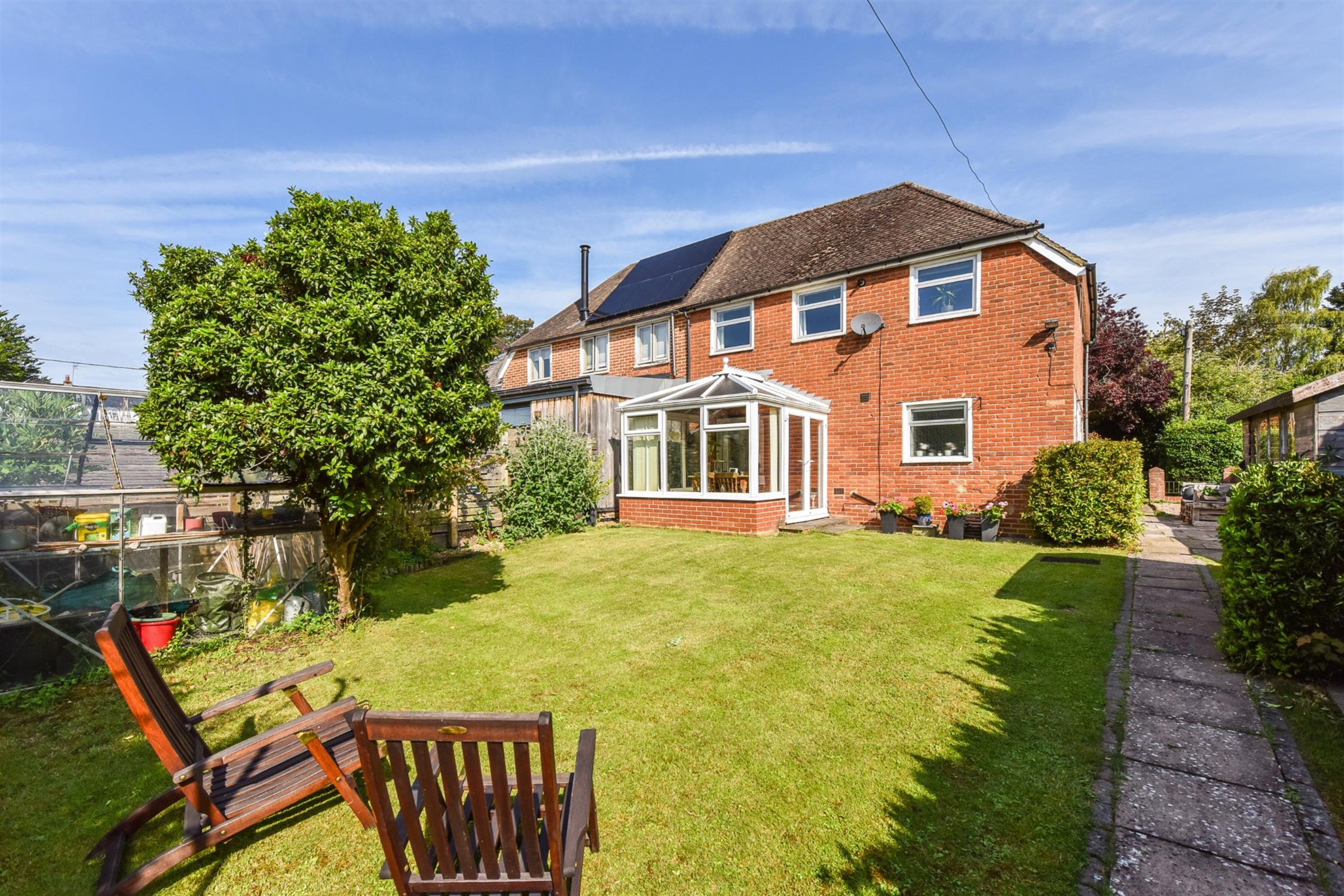 The sunny rear garden is mainly laid to lawn, with path to the rear gate, greenhouse and mature hedging.